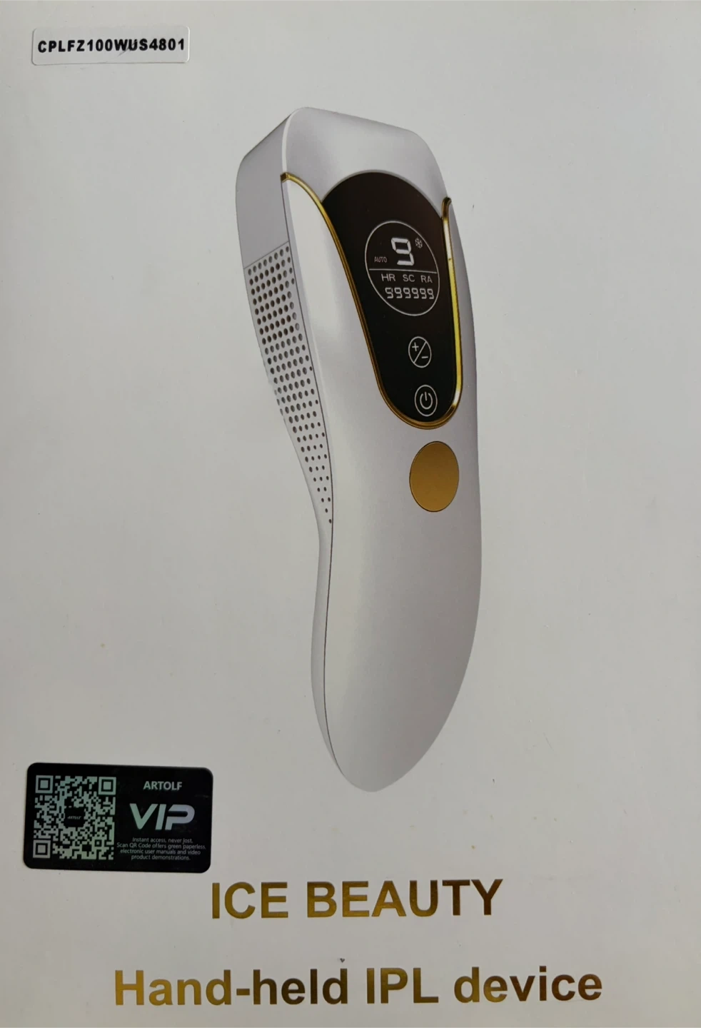 This is the ARTOLF ICE BEAUTY hand-held IPL device. It offers 999,999 flashes for lifetime use and features an LCD display and an ice compression panel.