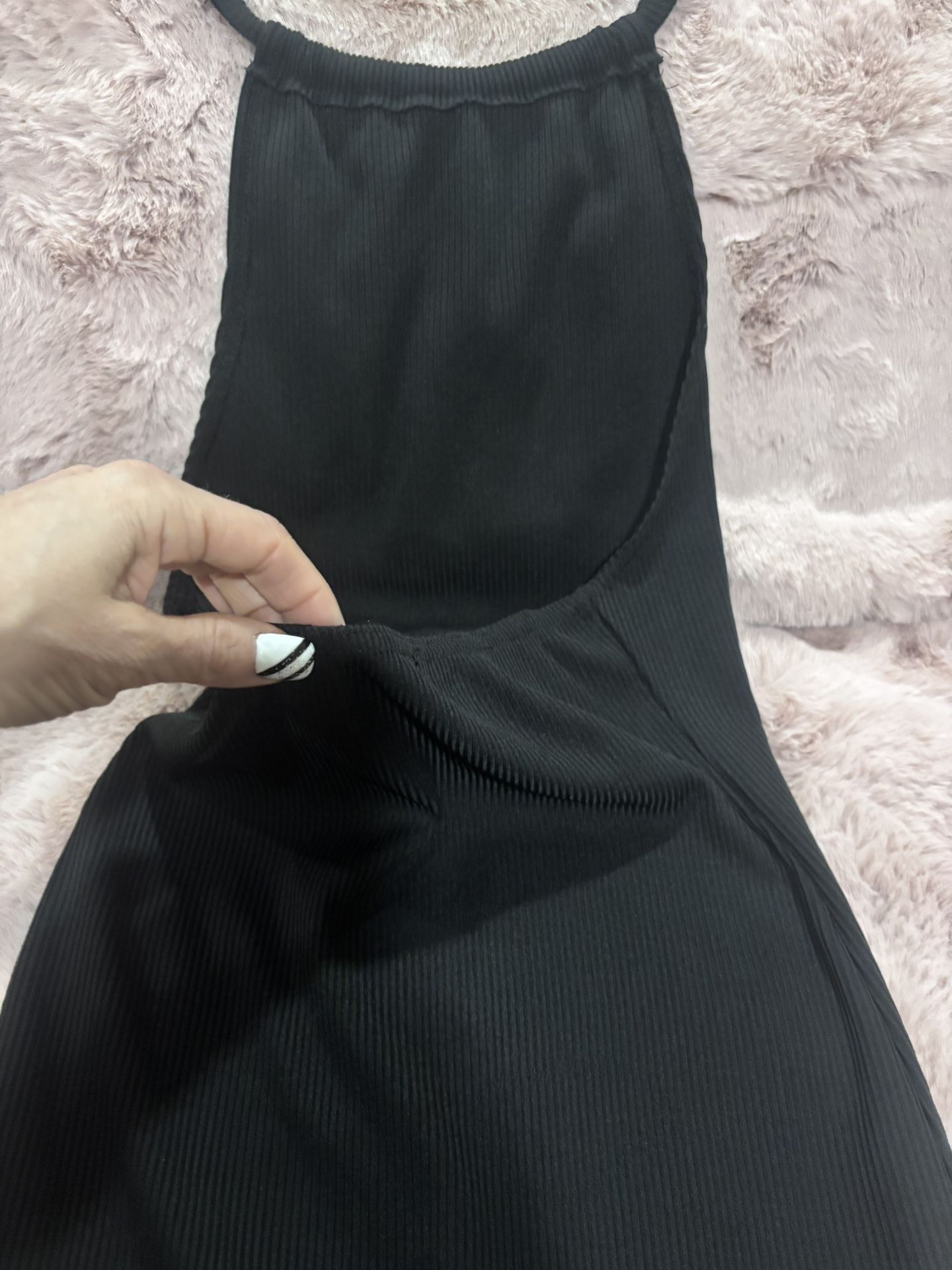 Simple, sexy, and effortlessly flattering. This black ribbed dress is a perfect minimalist staple with a subtle sultry edge. Size Small. Soft ribbed fabric. Half open back for a sexy, modern look. Lightweight & breathable. Body-skimming silhouette. Slips on easily. No label (brand unknown). Perfect for a night out, vacation, date night, or layering with a jacket or cardigan. Dress it up with heels or keep it casual with sandals. Excellent pre-owned condition.