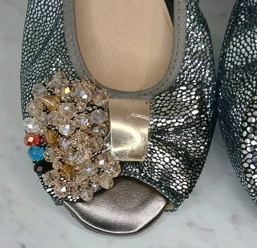 Silver Metallic Multi-colored Jewel Open Toe Ballerina Flats Size 7.5 -8 (US) and 38 (EU). There are minor marks on the top of the left flat. Features: Slip-on design, Smooth synthetic lining, Elasticated topline, Padded footbed, Rubber outsole.