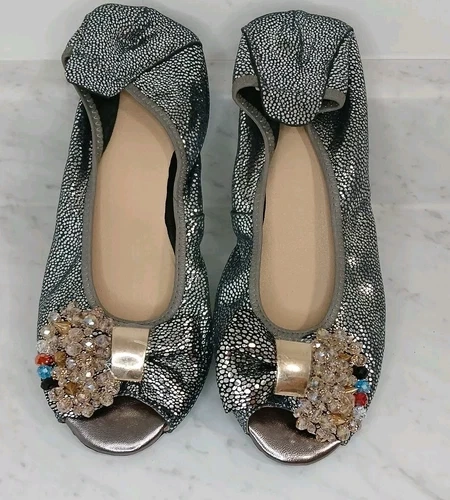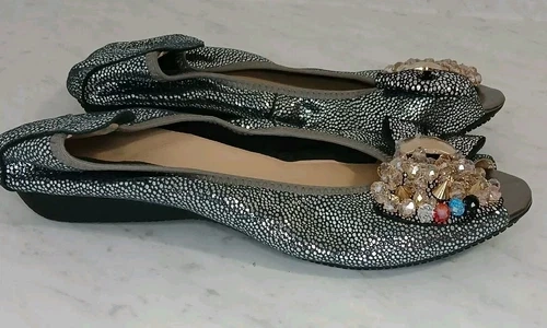 Silver Metallic Multi-colored Jewel Open Toe Ballerina Flats Size 7.5 -8 (US) and 38 (EU). There are minor marks on the top of the left flat. Features: Slip-on design, Smooth synthetic lining, Elasticated topline, Padded footbed, Rubber outsole.