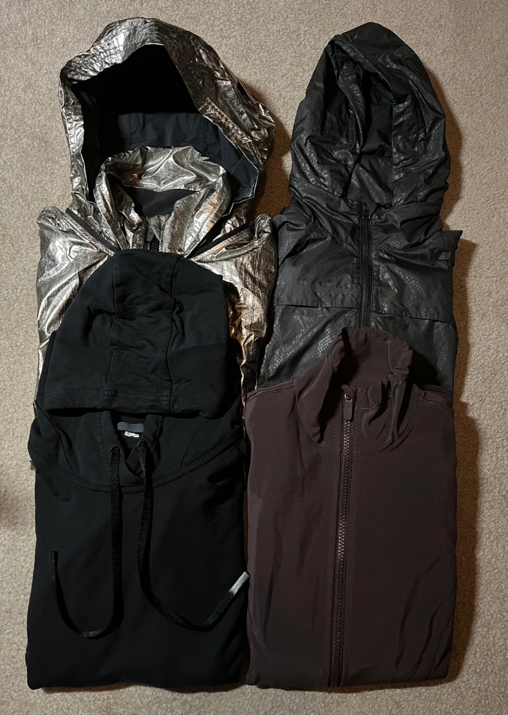 Excellent condition, no holes, rips or stains including 3 jackets, 1 pullover ( open back )
