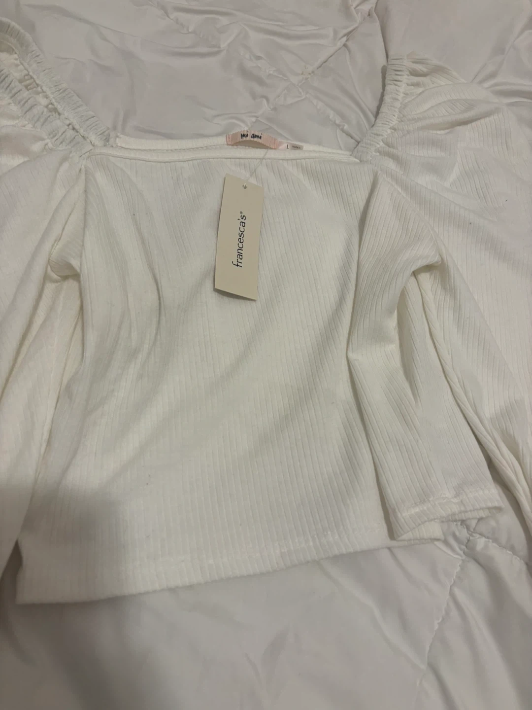 This is a white ribbed top from Mia Ami. It features puff sleeves and a square neckline. Size is large.
