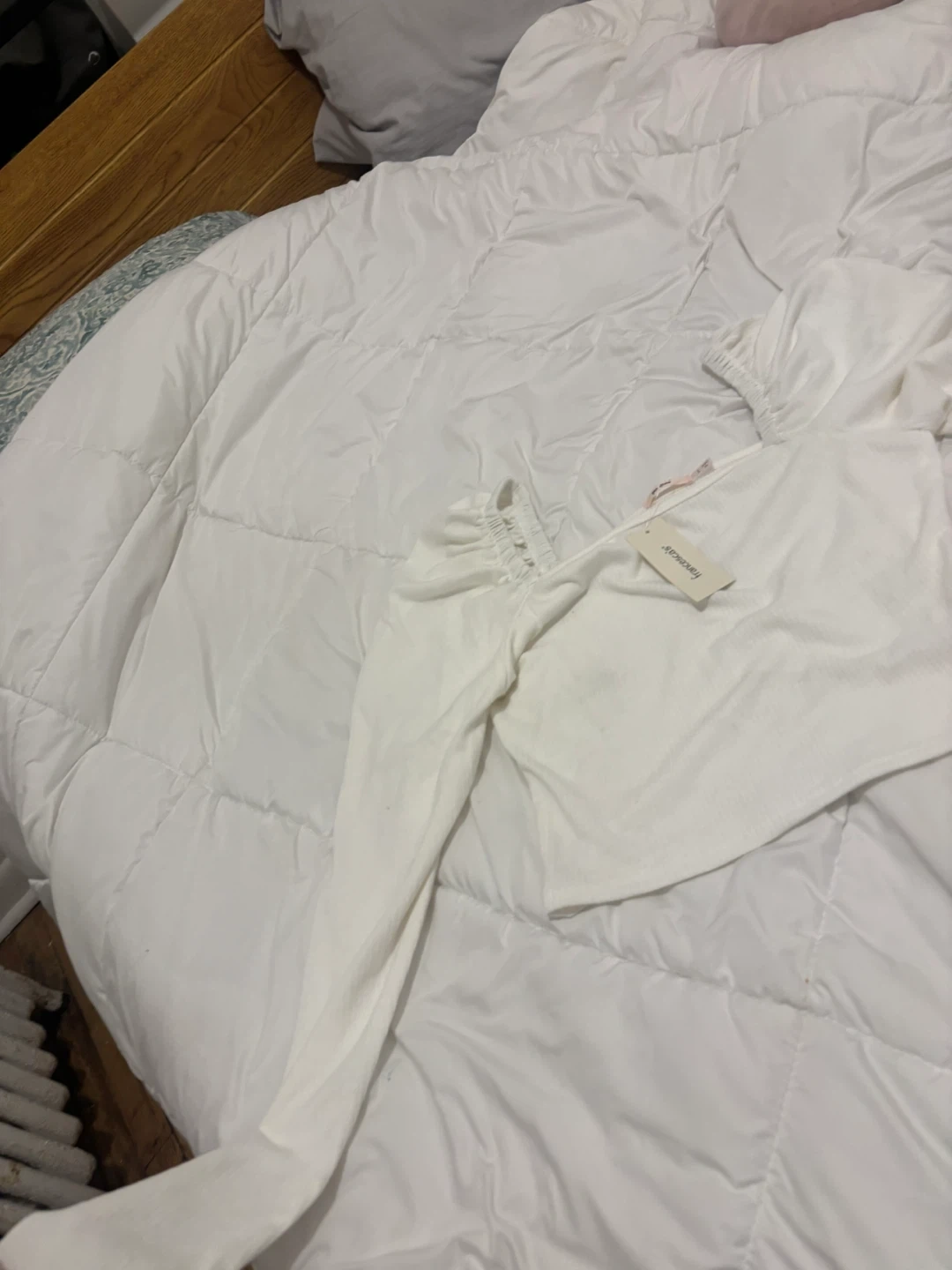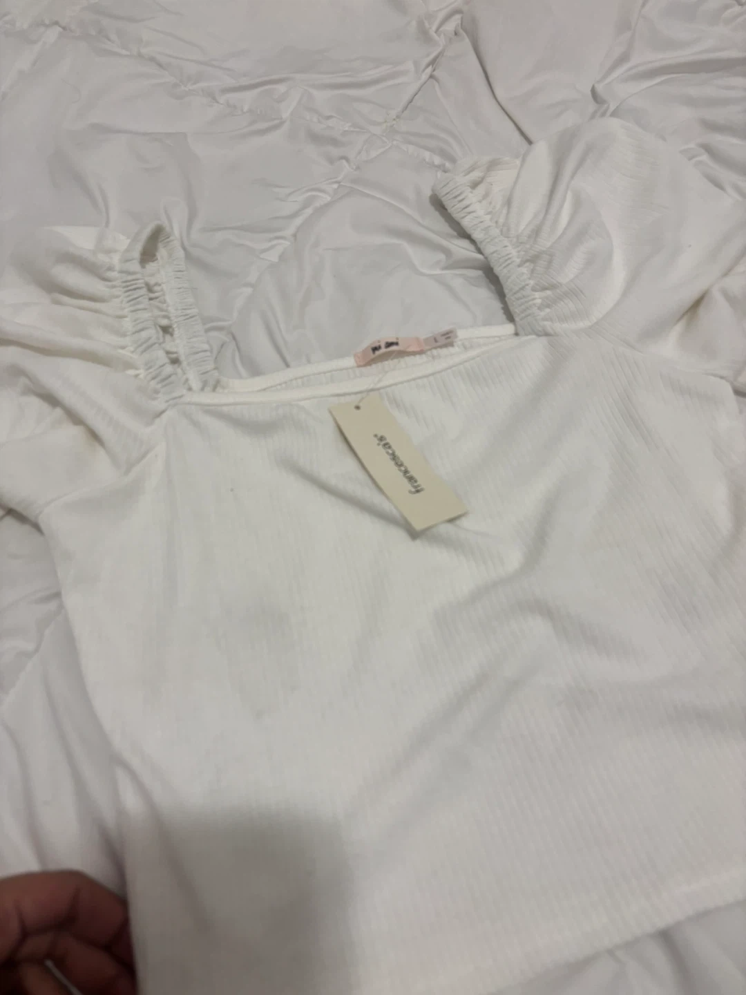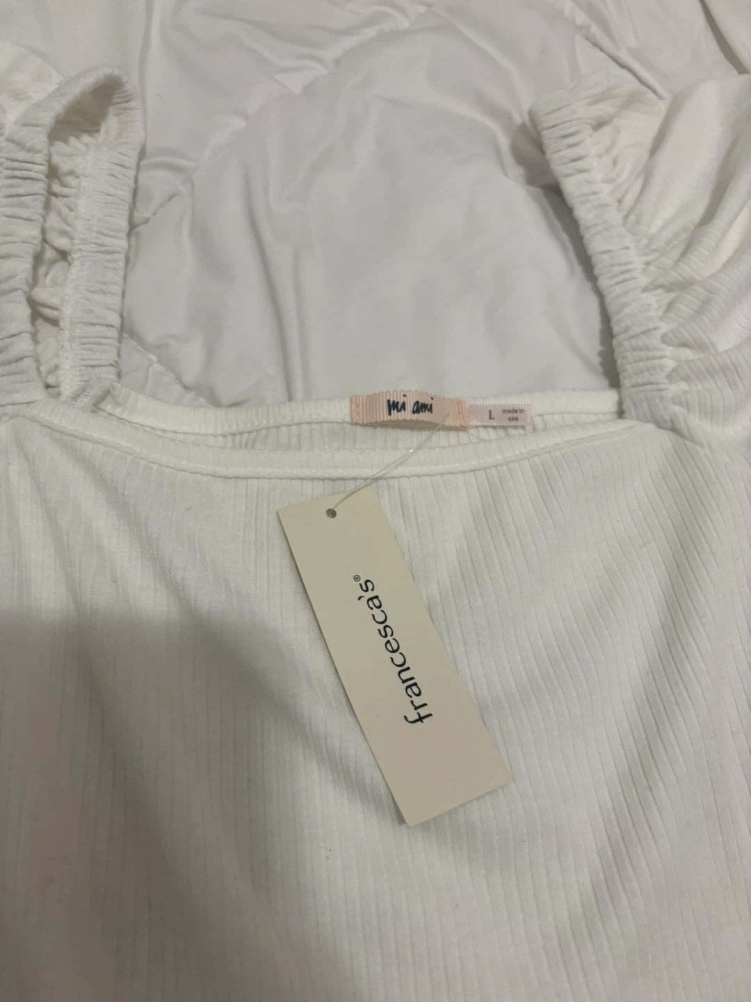 This is a white ribbed top from Mia Ami. It features puff sleeves and a square neckline. Size is large.