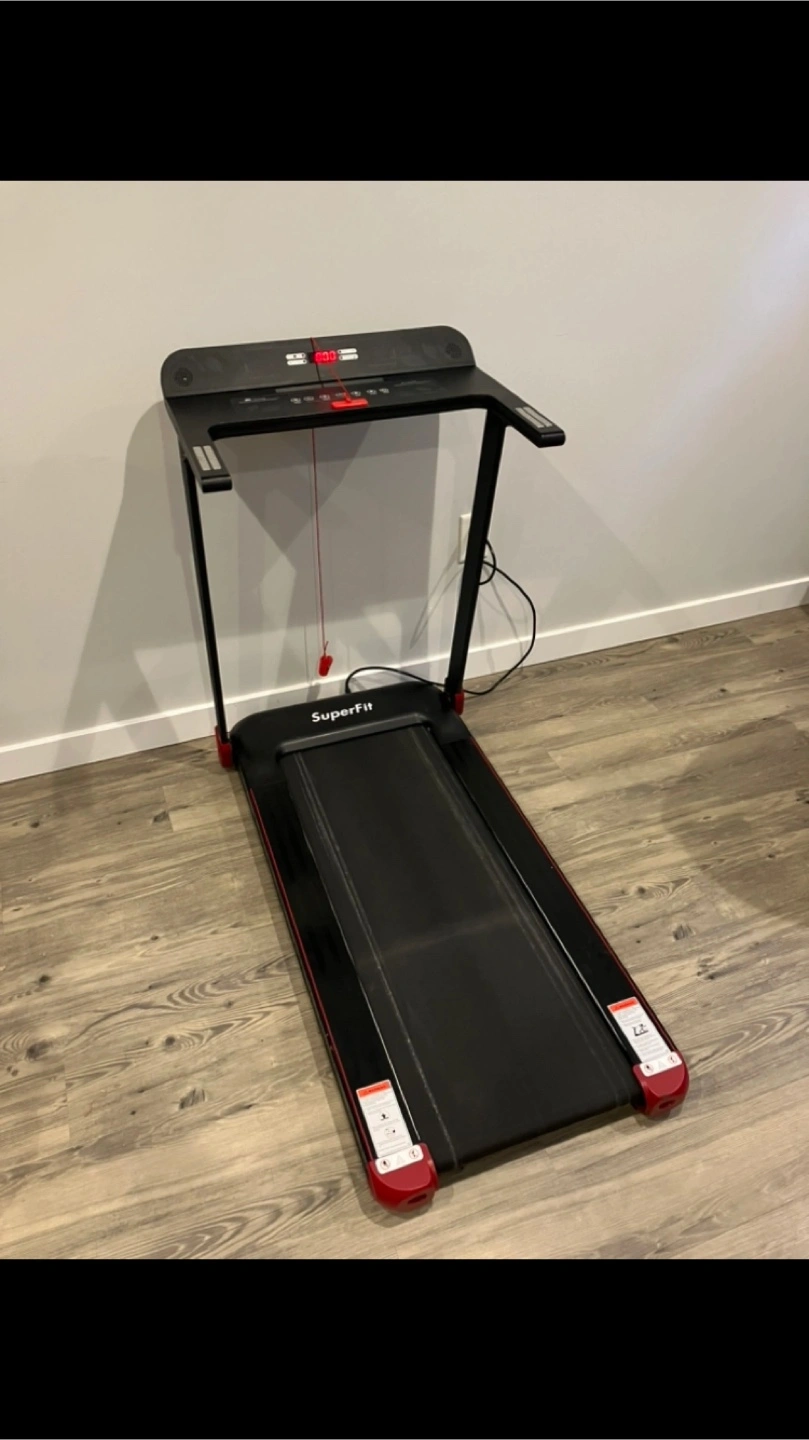 Compact treadmill, perfect for home workouts. Features a digital display showing speed, time, distance, and calories burned. Includes safety clip. Easy to store. Must pick up.