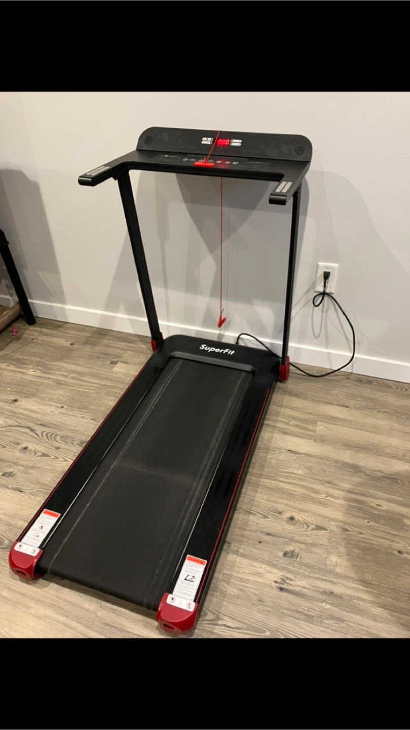 Compact treadmill, perfect for home workouts. Features a digital display showing speed, time, distance, and calories burned. Includes safety clip. Easy to store. Must pick up.