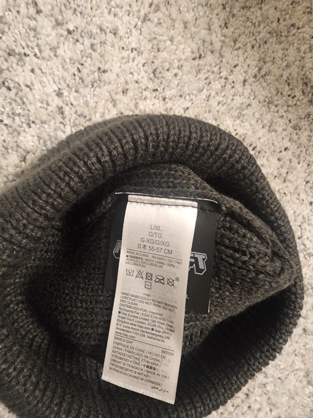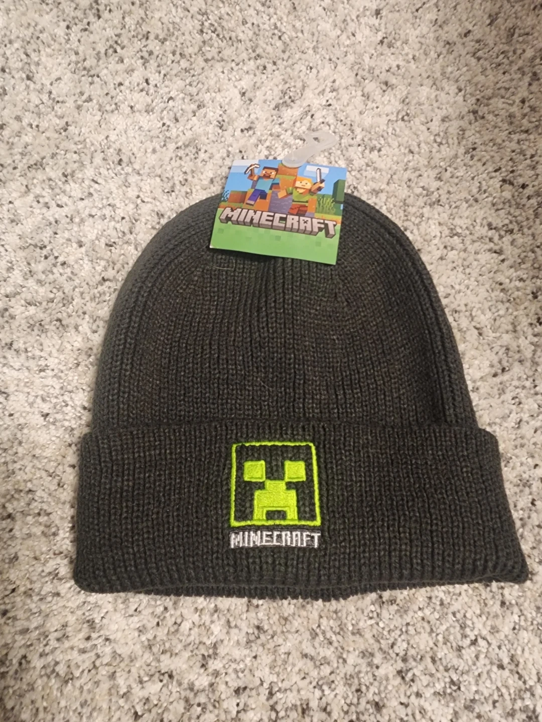 Grey knit beanie hat with Minecraft Creeper logo. Fits head sizes 55-57 cm L/XL Youth