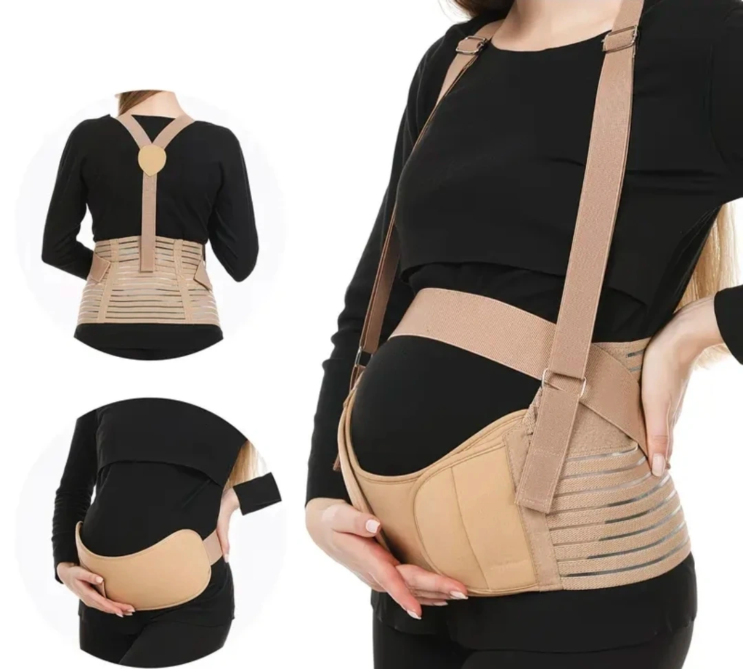 This beige pregnancy support belt is designed to offer comfort and support. It features adjustable straps for a customizable fit. It helps alleviate back pain during pregnancy.