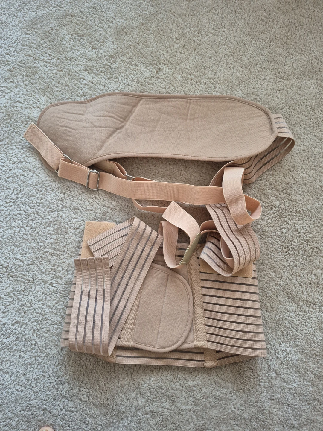 This beige pregnancy support belt is designed to offer comfort and support. It features adjustable straps for a customizable fit. It helps alleviate back pain during pregnancy.