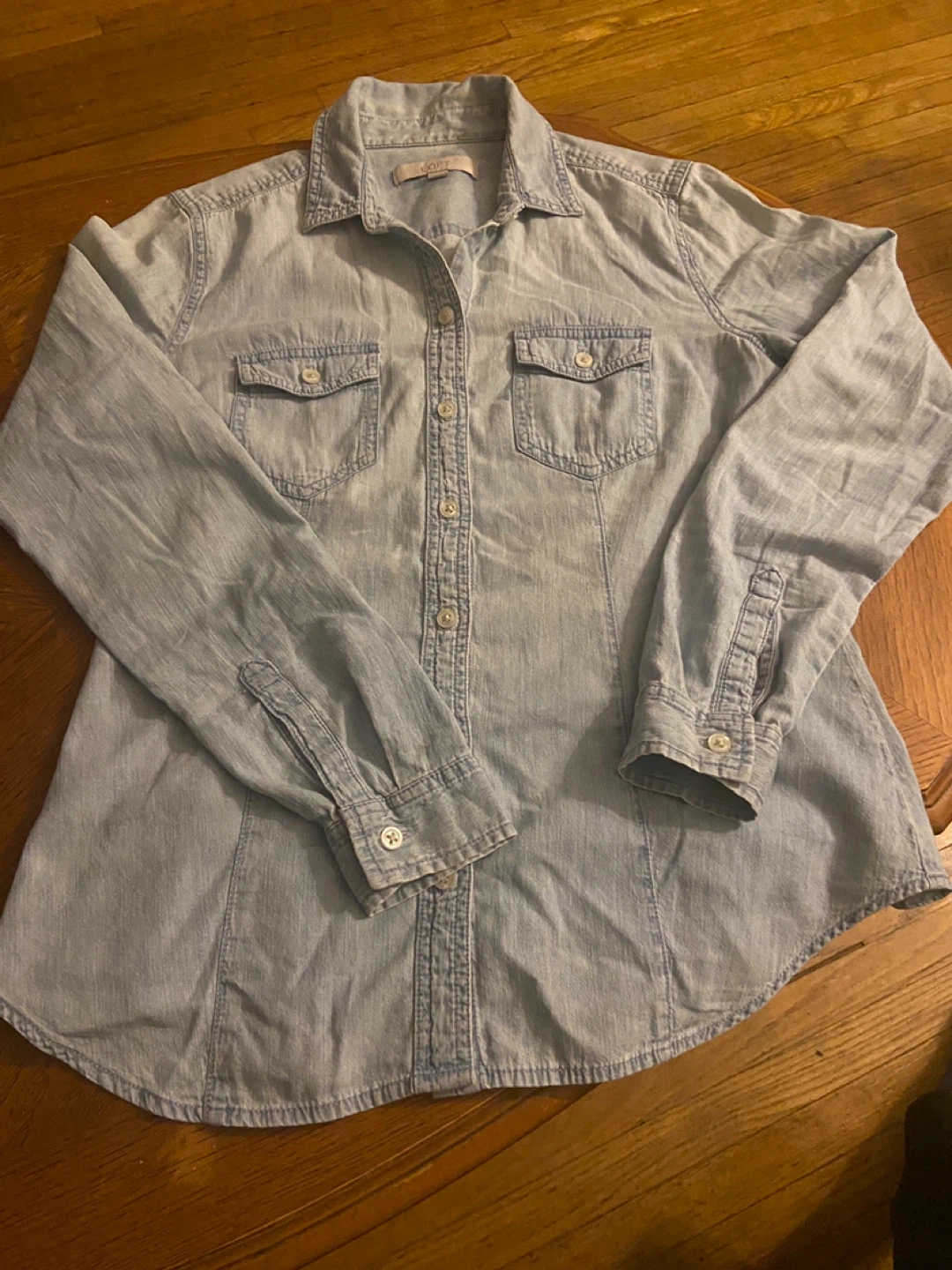 LOFT light wash denim shirt with button-up front and two chest pockets. Long sleeves with button cuffs. This classic shirt is made from a comfortable denim material. It's a versatile piece for any casual wardrobe!