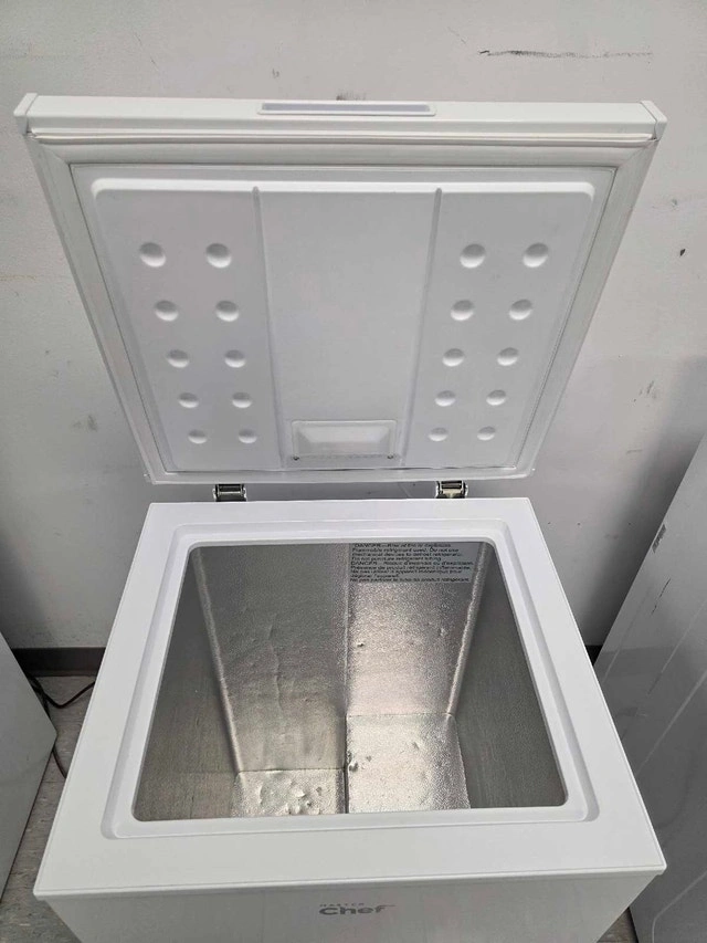 Master Chef Chest Freezer – $150 CAD. 3-MONTH WARRANTY included. Professional installation available. Old appliance disposal available (Small fee for delivery/install/disposal). Model: FZ40C1J (043-0292-2). Capacity: 3.5 cu. ft. Color: White. Compact size, perfect for condos, dorms, cottages & offices. Features a removable wire basket, interior LED light, adjustable temperature control (front-mount), power indicator light, manual defrost with drain hole, silent hinge & slow-closing lid. Uses eco-friendly R600a refrigerant and is ENERGY STAR® Certified.