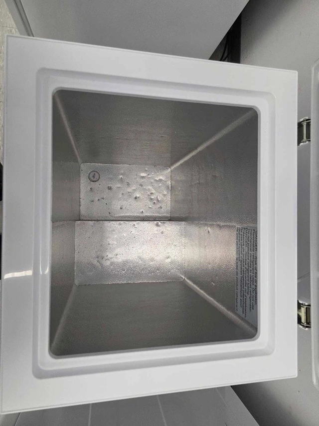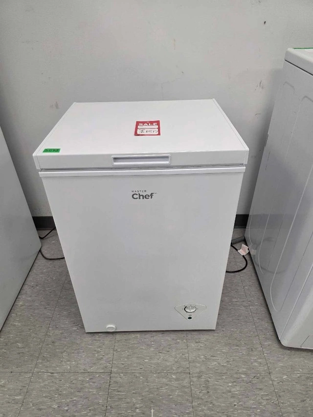 Master Chef Chest Freezer – $150 CAD. 3-MONTH WARRANTY included. Professional installation available. Old appliance disposal available (Small fee for delivery/install/disposal). Model: FZ40C1J (043-0292-2). Capacity: 3.5 cu. ft. Color: White. Compact size, perfect for condos, dorms, cottages & offices. Features a removable wire basket, interior LED light, adjustable temperature control (front-mount), power indicator light, manual defrost with drain hole, silent hinge & slow-closing lid. Uses eco-friendly R600a refrigerant and is ENERGY STAR® Certified.