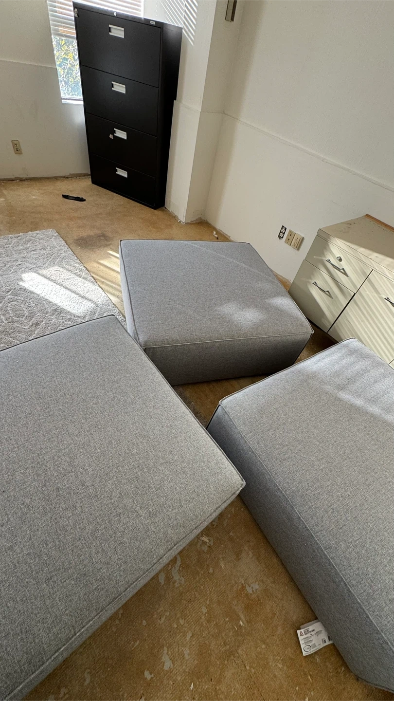 Selling a set of three grey square ottomans. They're in good condition and would be a great addition to any living space! The colour is a neutral grey, so they'll match almost any decor