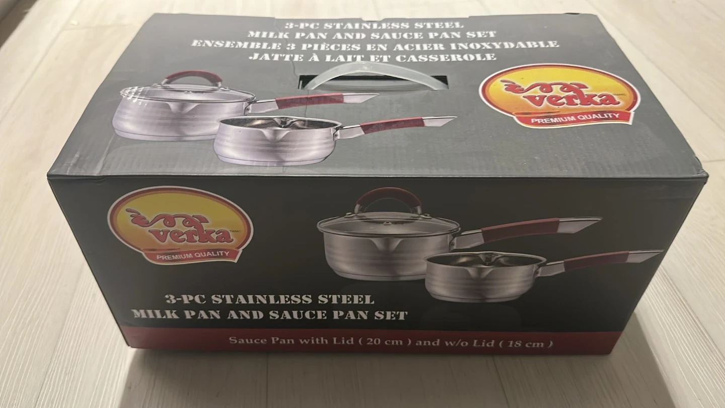 This is a 3-piece set of Verka stainless steel milk pans and sauce pans. It includes one sauce pan with a lid (20 cm) and one sauce pan without a lid (18 cm). These pans are made of durable stainless steel with comfortable handles. Great for everyday kitchen tasks!