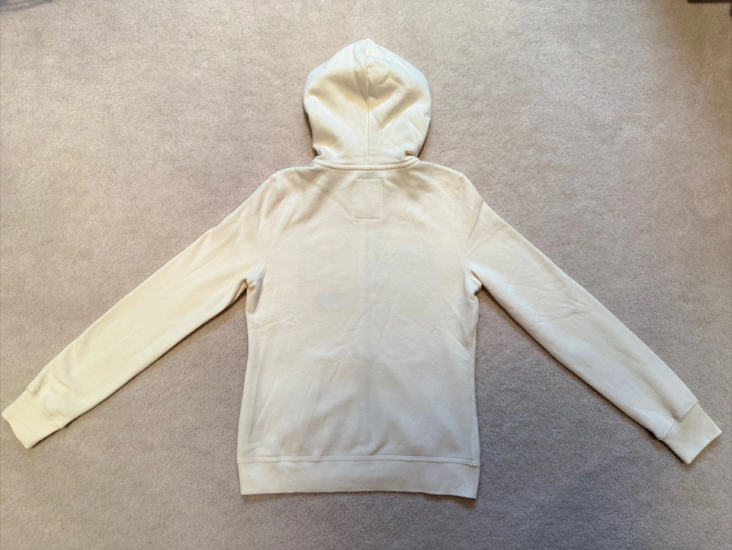 Cozy Aeropostale full zip hoodie in a cream colour! It's a size large. The inner hoodie is a light shade of grey that gives a nice contrast to the creamy colour of the hoodie. Made of 70% cotton and 30% polyester, so it's comfy and easy to care for.