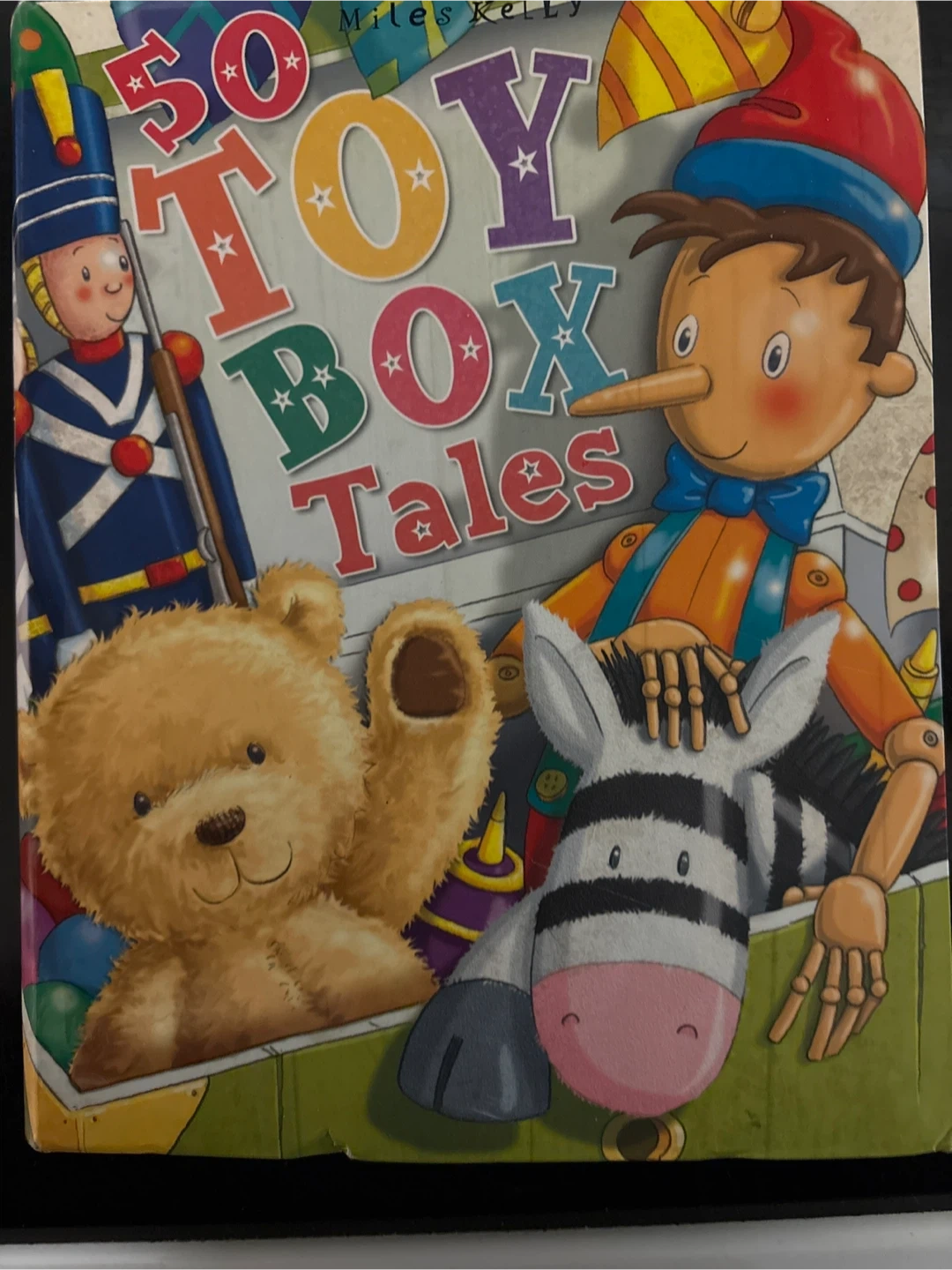 This is a children's book titled '50 Toy Box Tales'. It features classic characters like Pinocchio and a toy soldier. This collection of stories is suitable for young readers.