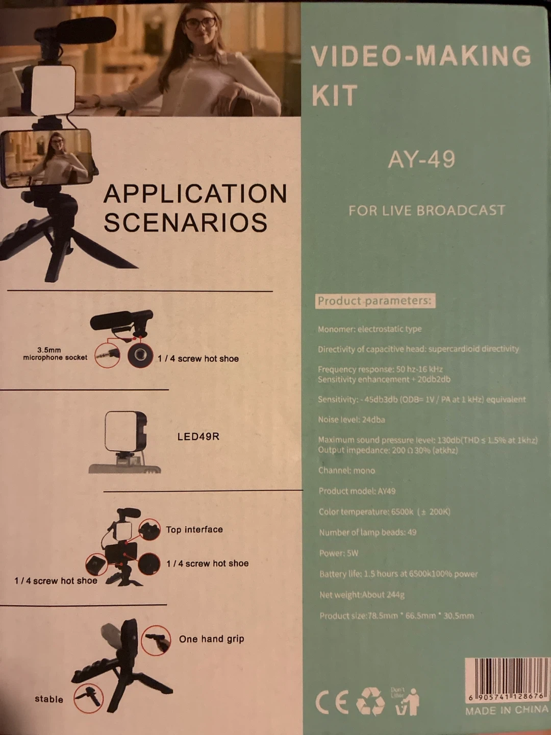 This video-making kit includes a microphone, LED flash light, and a smartphone universal holder. The LED flash light measures 7.2*2cm and the microphone has a supercardioid directivity. It's designed for live broadcast applications.