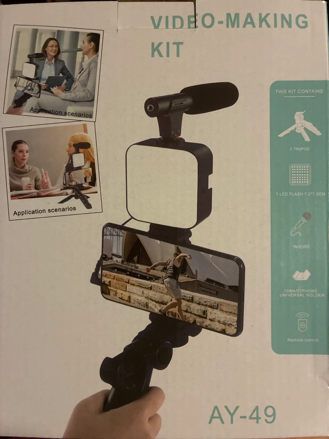 This video-making kit includes a microphone, LED flash light, and a smartphone universal holder. The LED flash light measures 7.2*2cm and the microphone has a supercardioid directivity. It's designed for live broadcast applications.