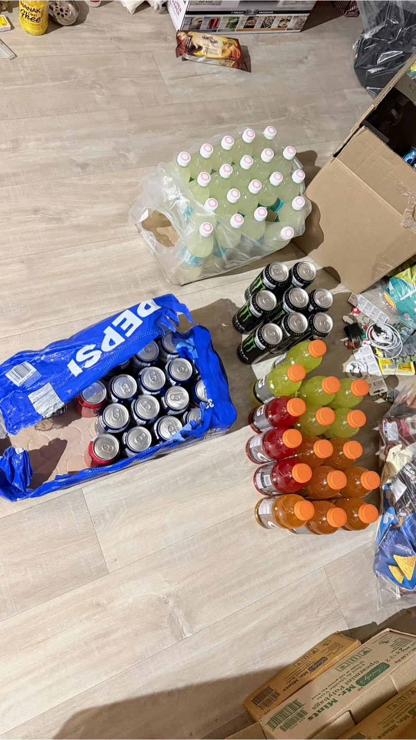 A collection of beverages including Pepsi cans and various other drink bottles. Includes a large bag of Pepsi cans and a variety of Gatorade and Monster Energy drinks. Also includes a bag of drinks with pink caps.