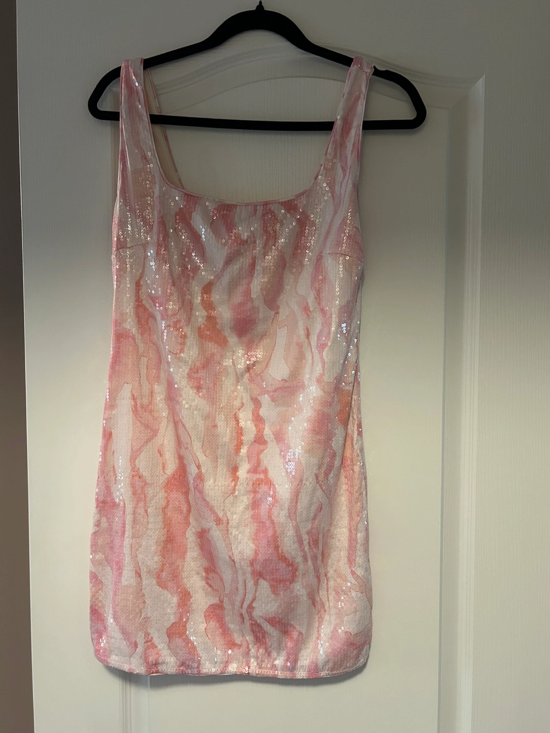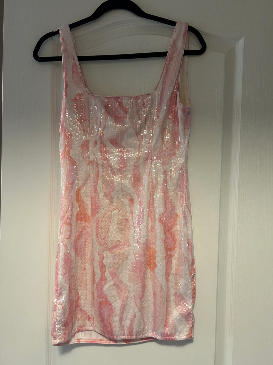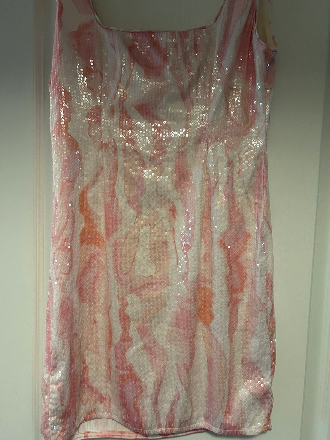 Here's a cute pink and white sequin mini dress! It's perfect for a night out or a special occasion. It's in great condition and ready for a new home