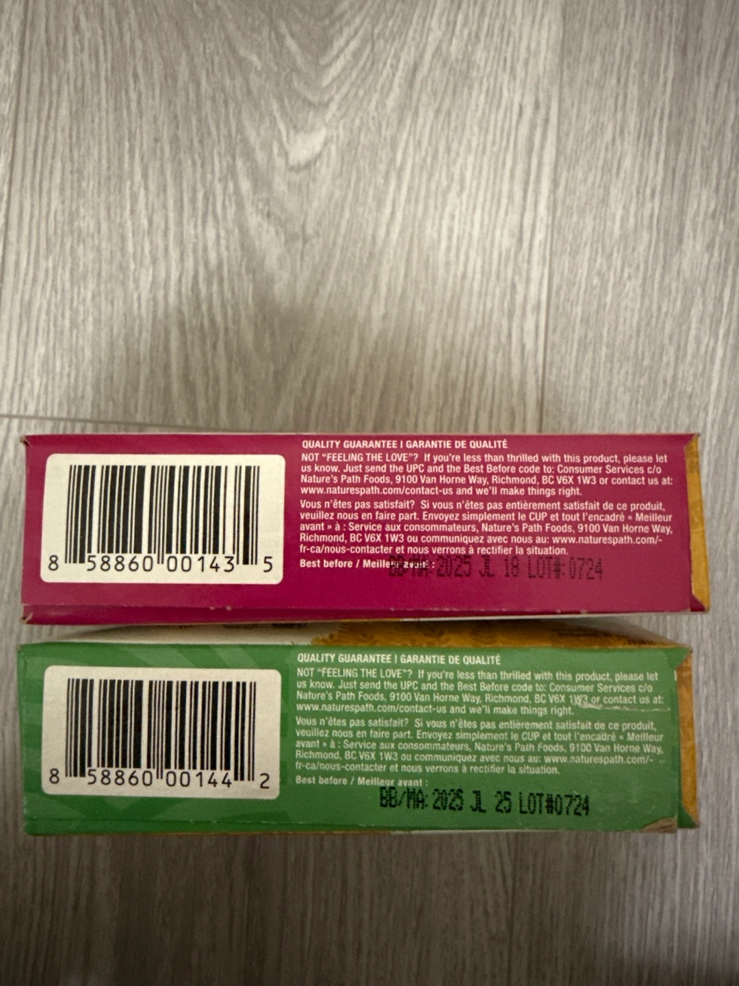 Two boxes of Nature's Path Oaty Chomps organic bars. One box is raspberry and beet flavour, and the other is cherry and spinach flavour. Both are naturally flavoured and weigh 138g. Great for kids 12 months and up! They expire in 2025 July 18 and 25th