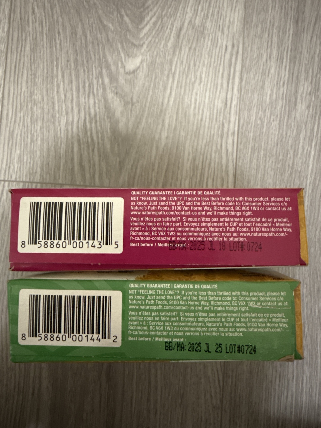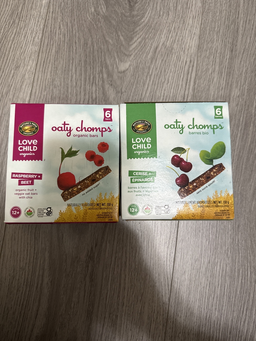 Two boxes of Nature's Path Oaty Chomps organic bars. One box is raspberry and beet flavour, and the other is cherry and spinach flavour. Both are naturally flavoured and weigh 138g. Great for kids 12 months and up! They expire in 2025 July 18 and 25th