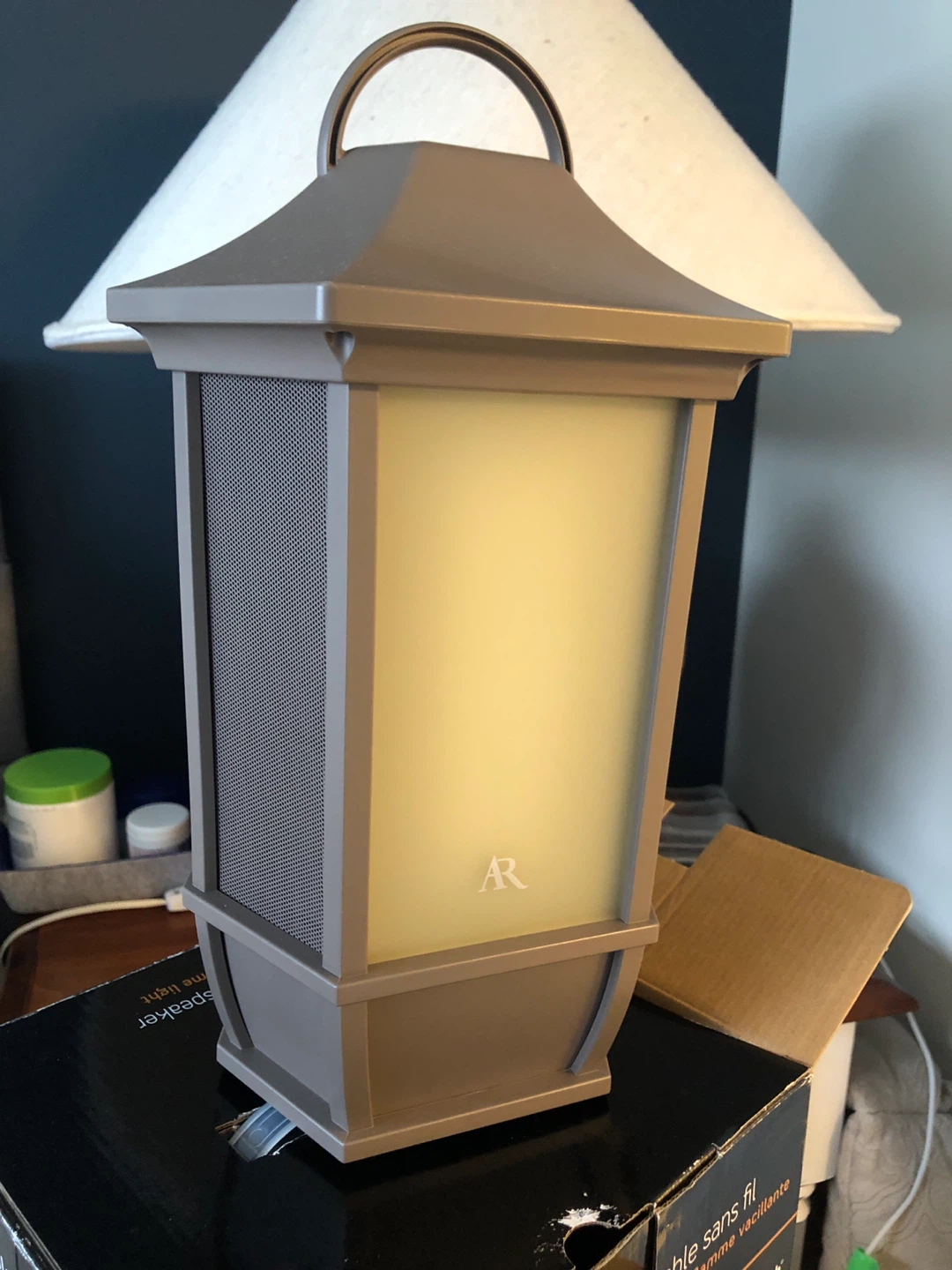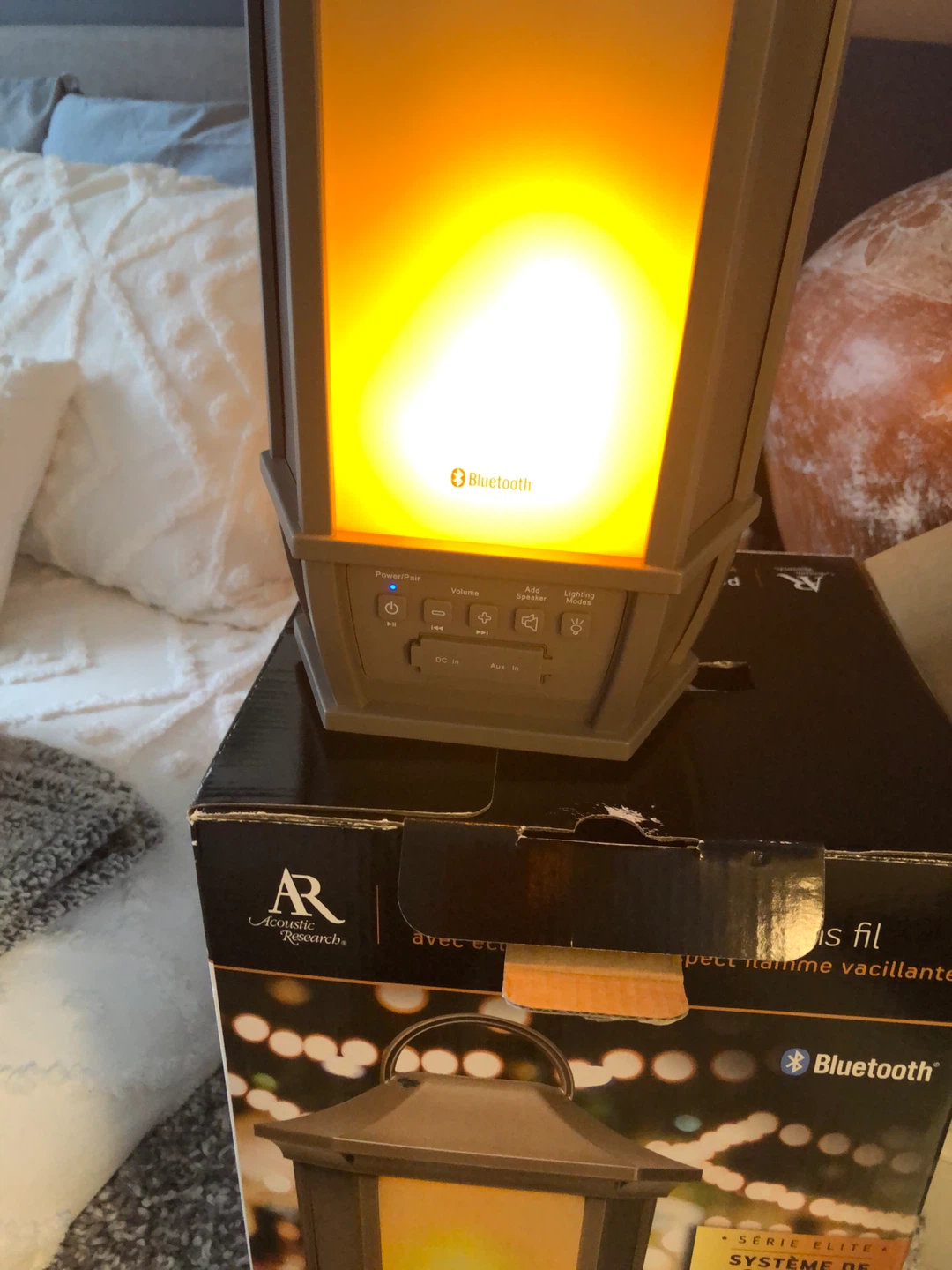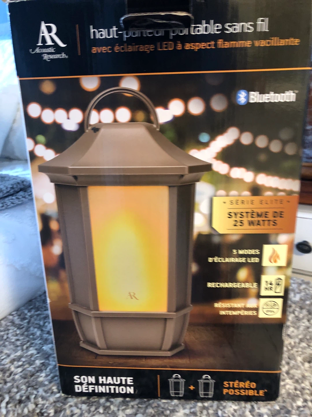 This is an Acoustic Research portable speaker with Bluetooth connectivity and a realistic LED flame lighting effect. It's rechargeable and weather-resistant, perfect for outdoor and indoor use.