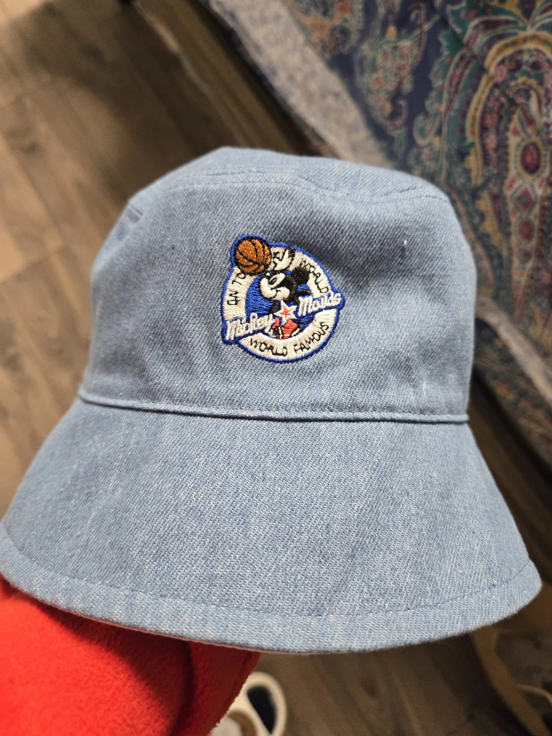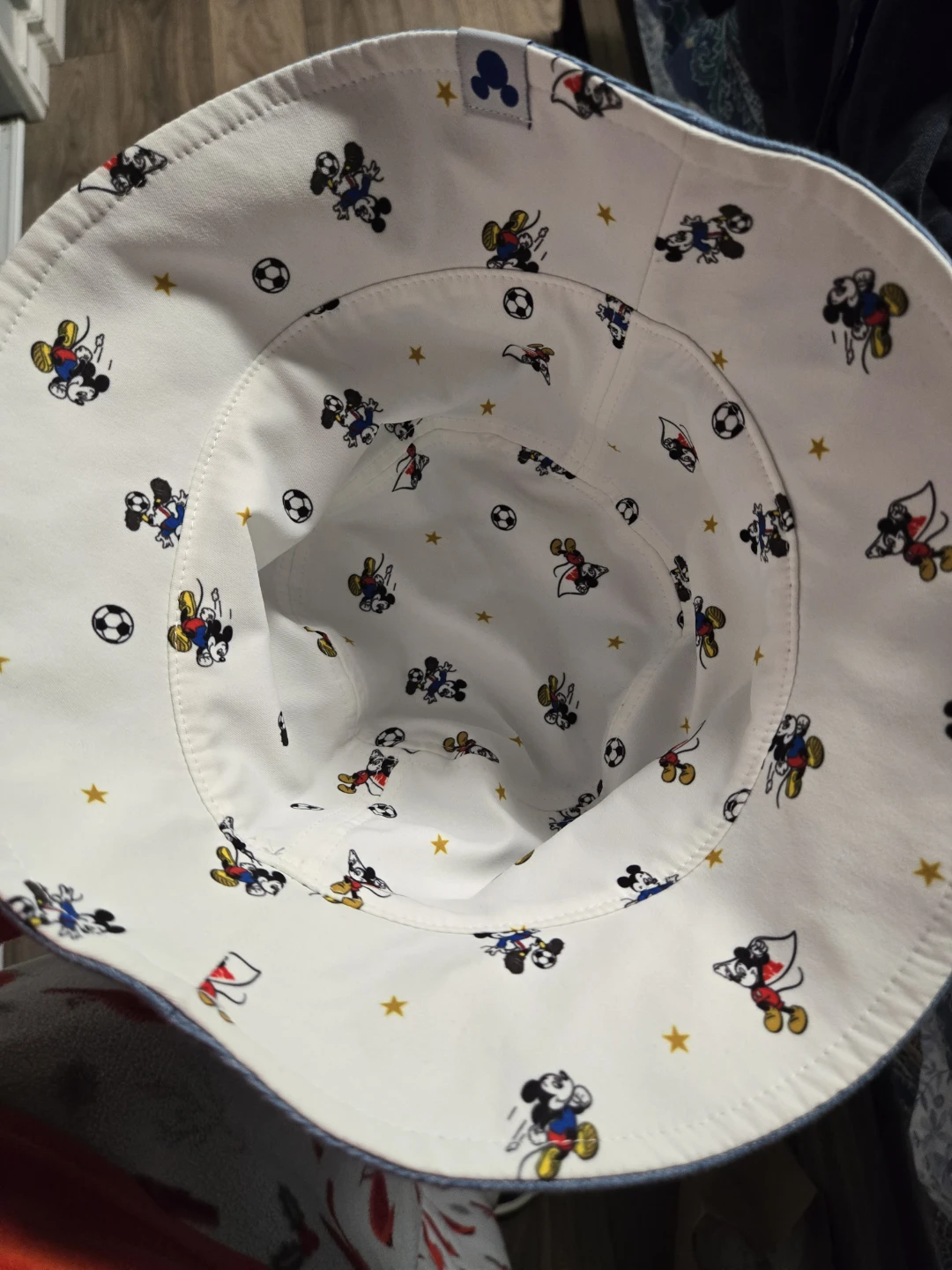 Here's a cute Disney Mickey Mouse bucket hat! It's a light blue denim on the outside with a fun Mickey Mouse and sports pattern on the inside. Perfect for sunny days!