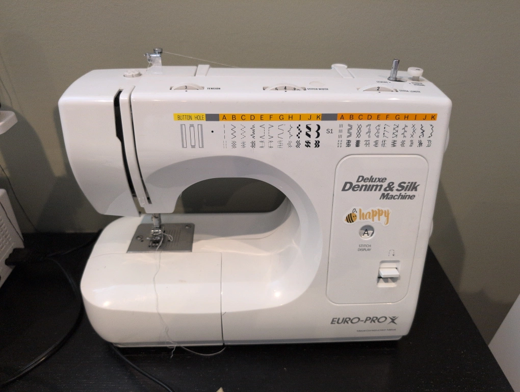 A white sewing machine. Features a range of stitch options. Might be great for a beginner project, sewing is such a wonderful hobby for winding down after a long day. includes pedal and accessories