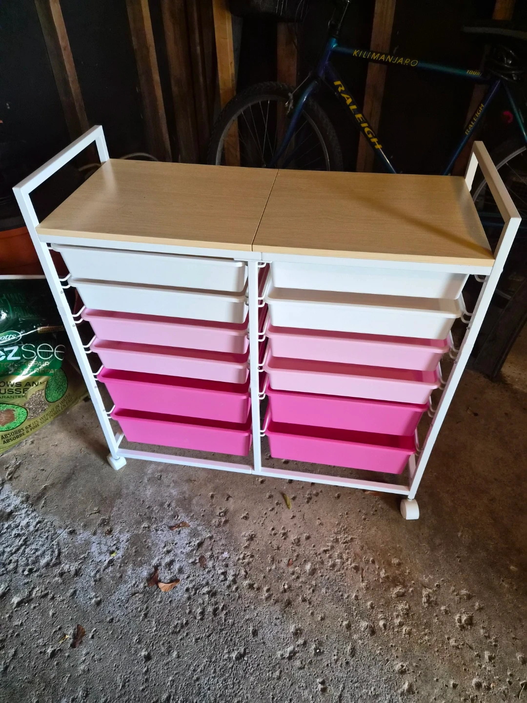 This white metal storage cart features a wood-look top and ten drawers in a gradient of pink and white. It's on wheels for easy mobility. Great for organizing craft supplies or small items!