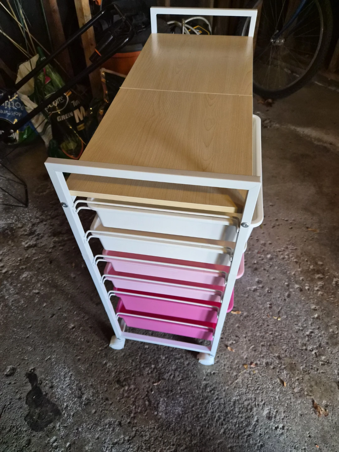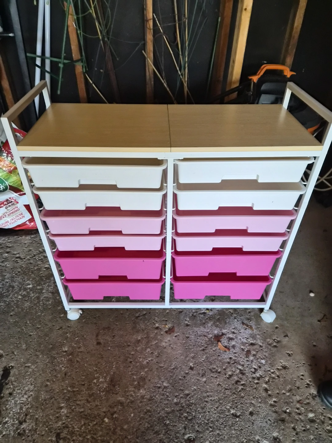 This white metal storage cart features a wood-look top and ten drawers in a gradient of pink and white. It's on wheels for easy mobility. Great for organizing craft supplies or small items!