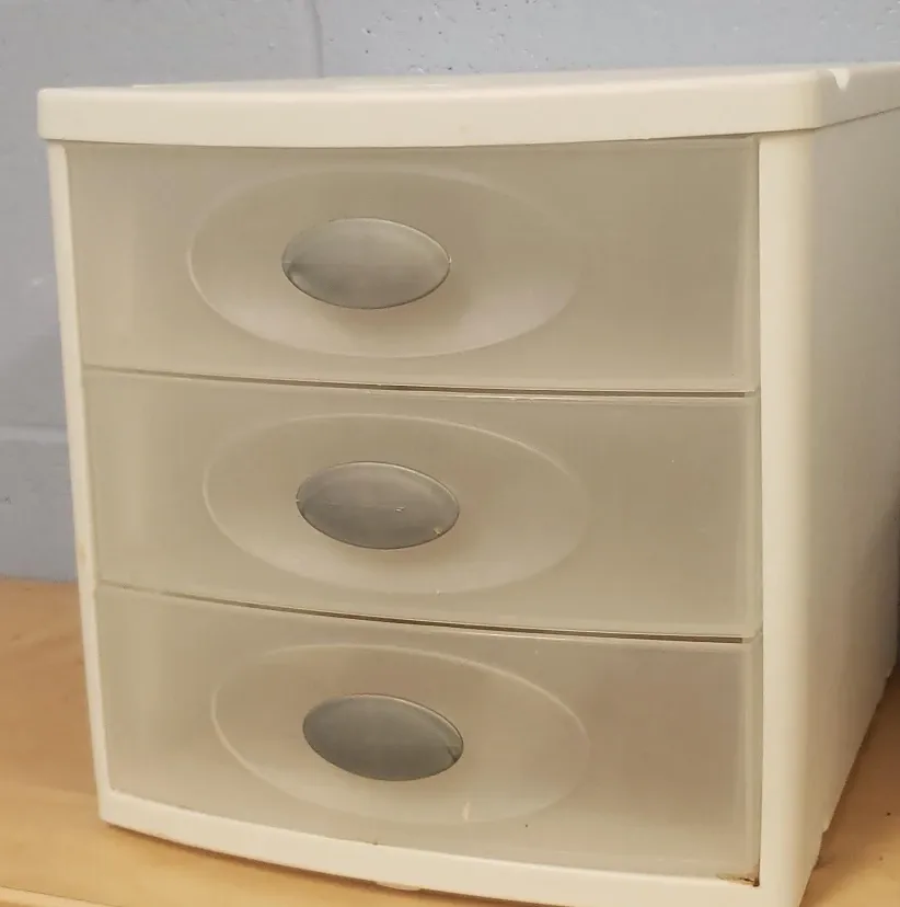 Here's a handy little desktop storage container with three drawers! Perfect for organizing small items around the house or office. It's in good condition and ready for a new home