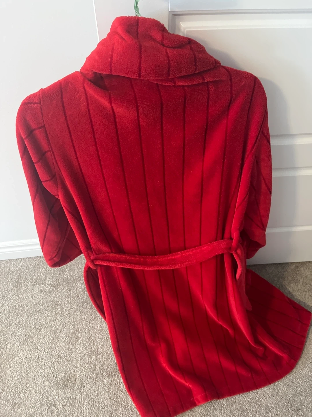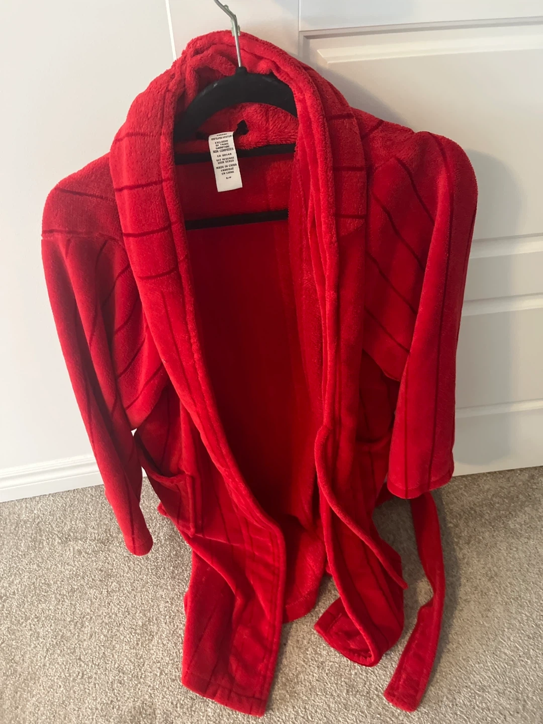 Selling a cozy red robe! It's made of 100% polyester and is a size S/P. Perfect for lounging around the house. Pet and smoke free home đźŹ