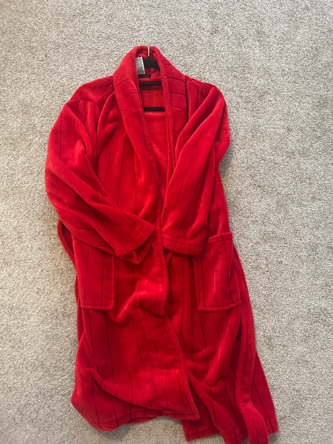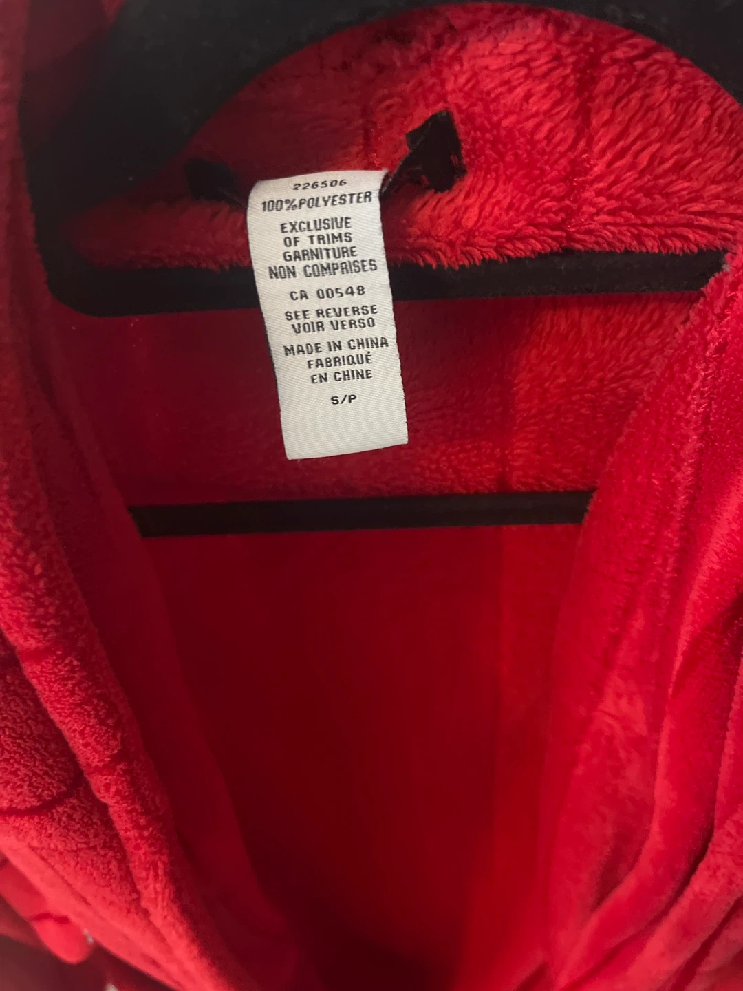 Selling a cozy red robe! It's made of 100% polyester and is a size S/P. Perfect for lounging around the house. Pet and smoke free home đźŹ