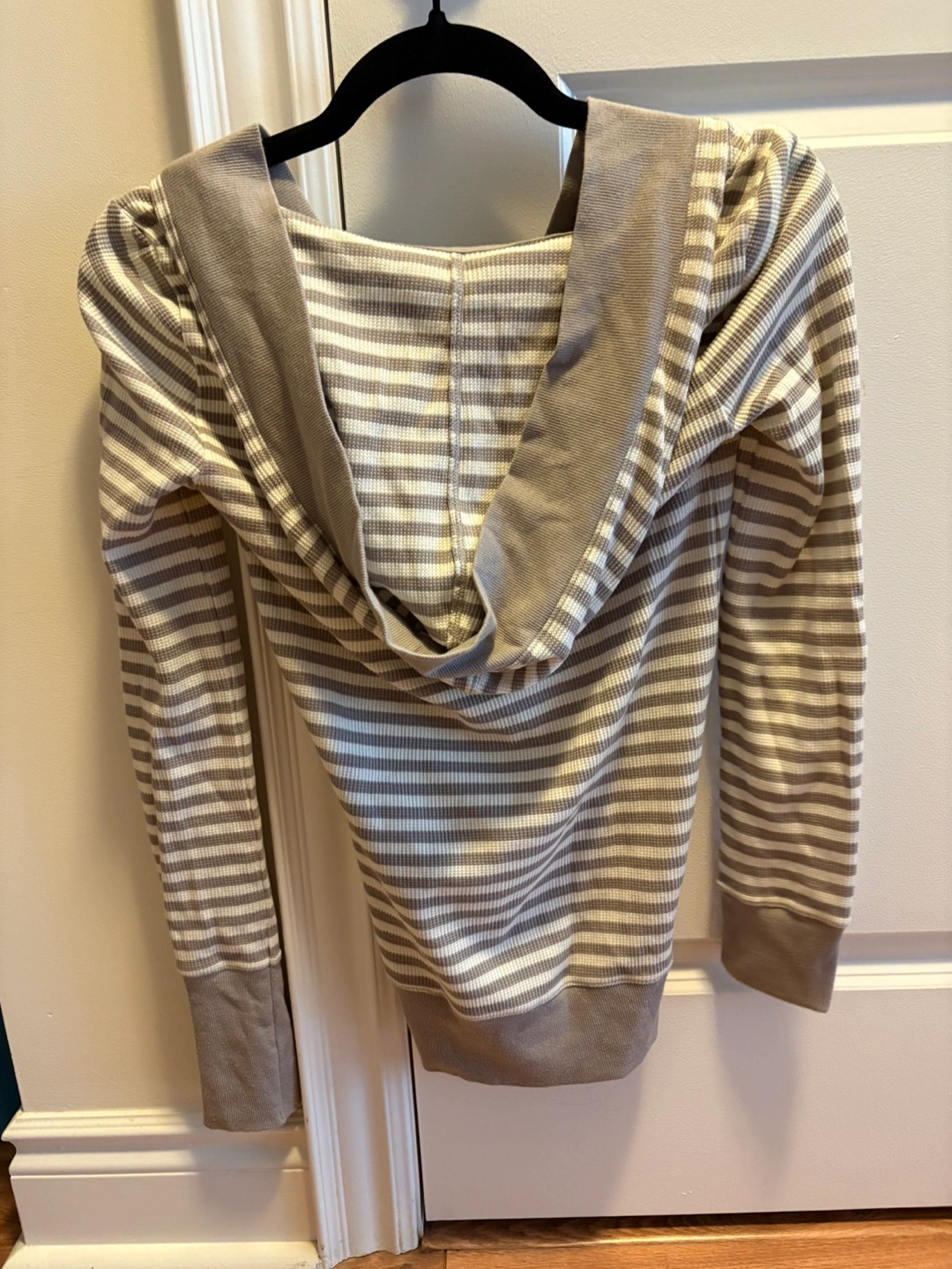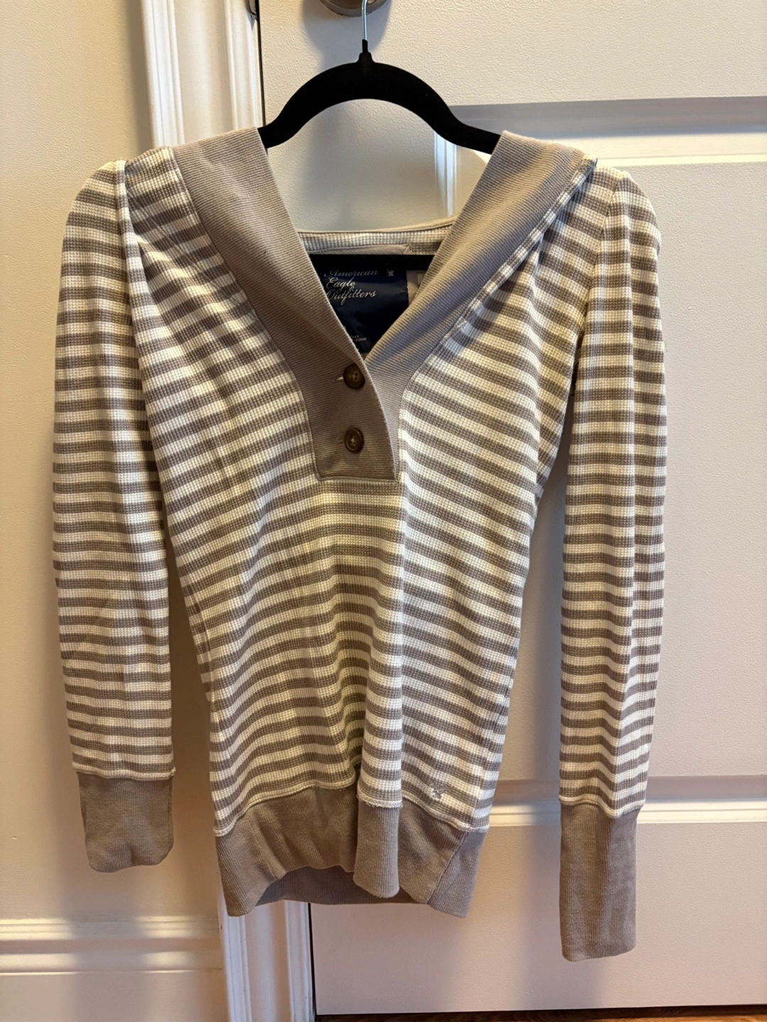 Here's a cute American Eagle Outfitters striped hoodie in size small! It's in great condition, only worn 2 to 3 times. The stripes are a mix of white and grey colour. It features a hood and a button-up neckline. Perfect for layering or wearing on its own!
