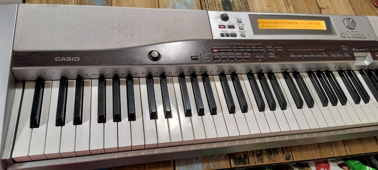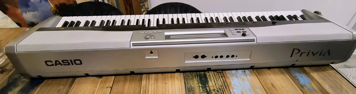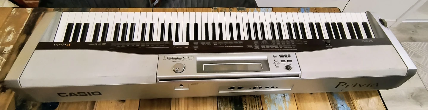 This is a Casio Privia PX-555R digital piano. It's silver and features 88 full weighted keys. Includes power adapter.