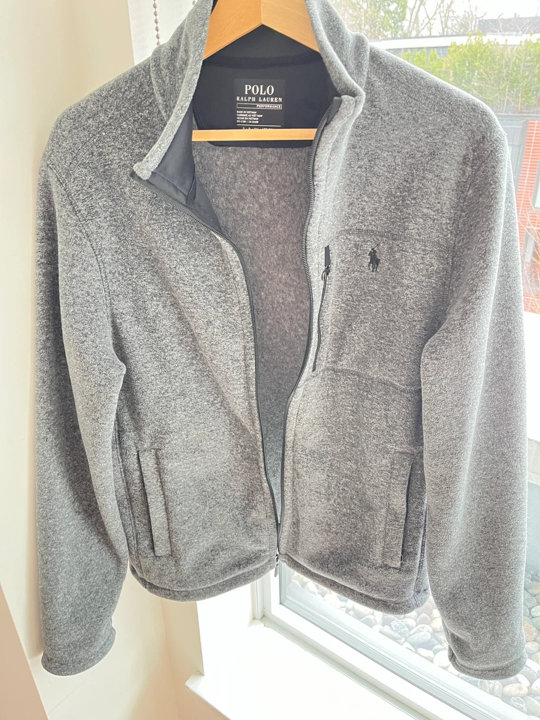 Polo Ralph Lauren performance fleece jacket in heather grey. It's a size small with a full zip closure and two side pockets. Features a zippered chest pocket as well. Slightly used basically new.