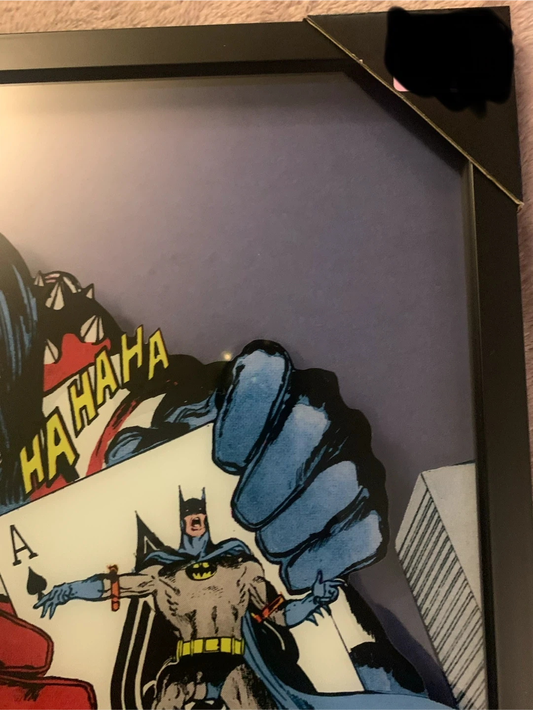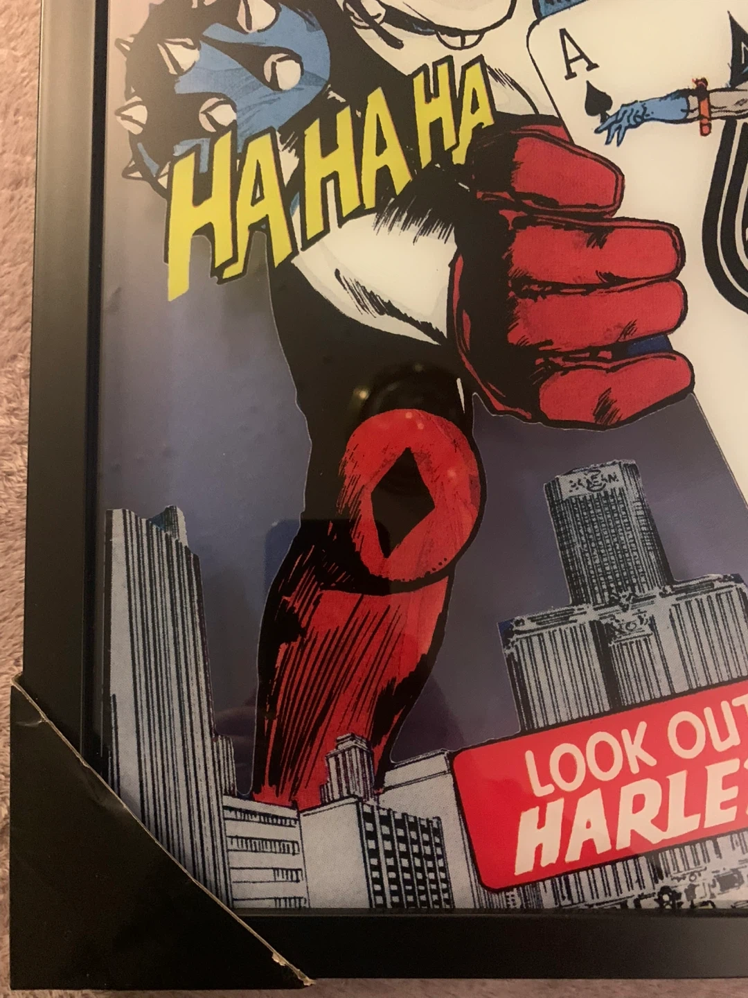 Framed comic art featuring Harley Quinn and Batman. Text reads "LOOK OUT, GOTHAM! HARLEY'S BACK IN TOWN!". Made by popCreations.
