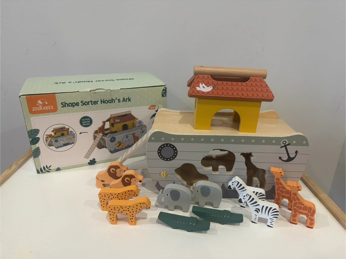 This Zookabee Noah's Ark shape sorter comes with the ark and 12 wooden animal pieces. It's recommended for ages 18 months and up. Great for developing fine motor skills!
