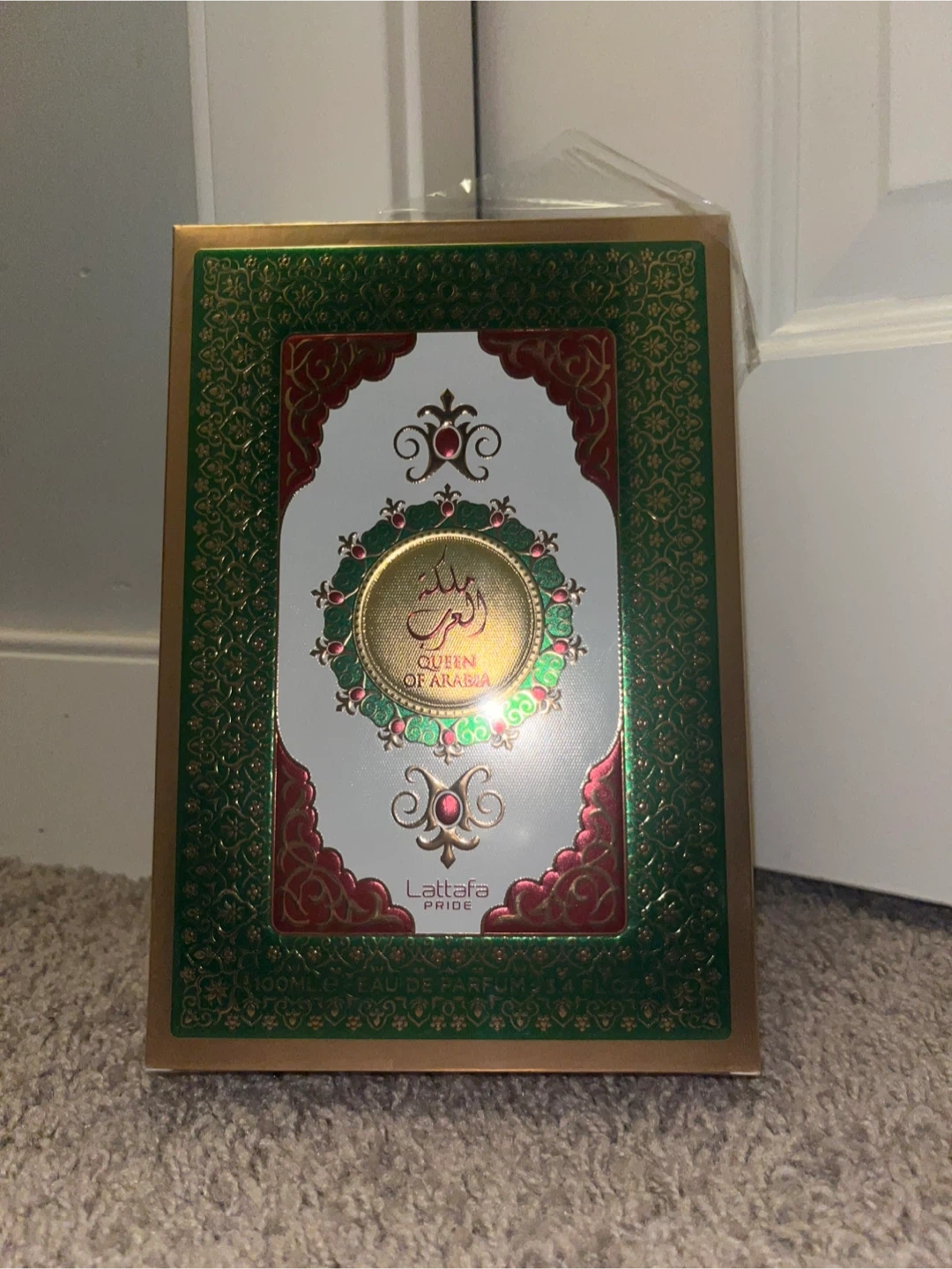 This Lattafa "Queen of Arabia" perfume gift set includes a large bottle and five mini spray vials. It comes in a decorative presentation box. The set is from Lattafa Pride. This would be a lovely gift for someone who enjoys fine fragrances!