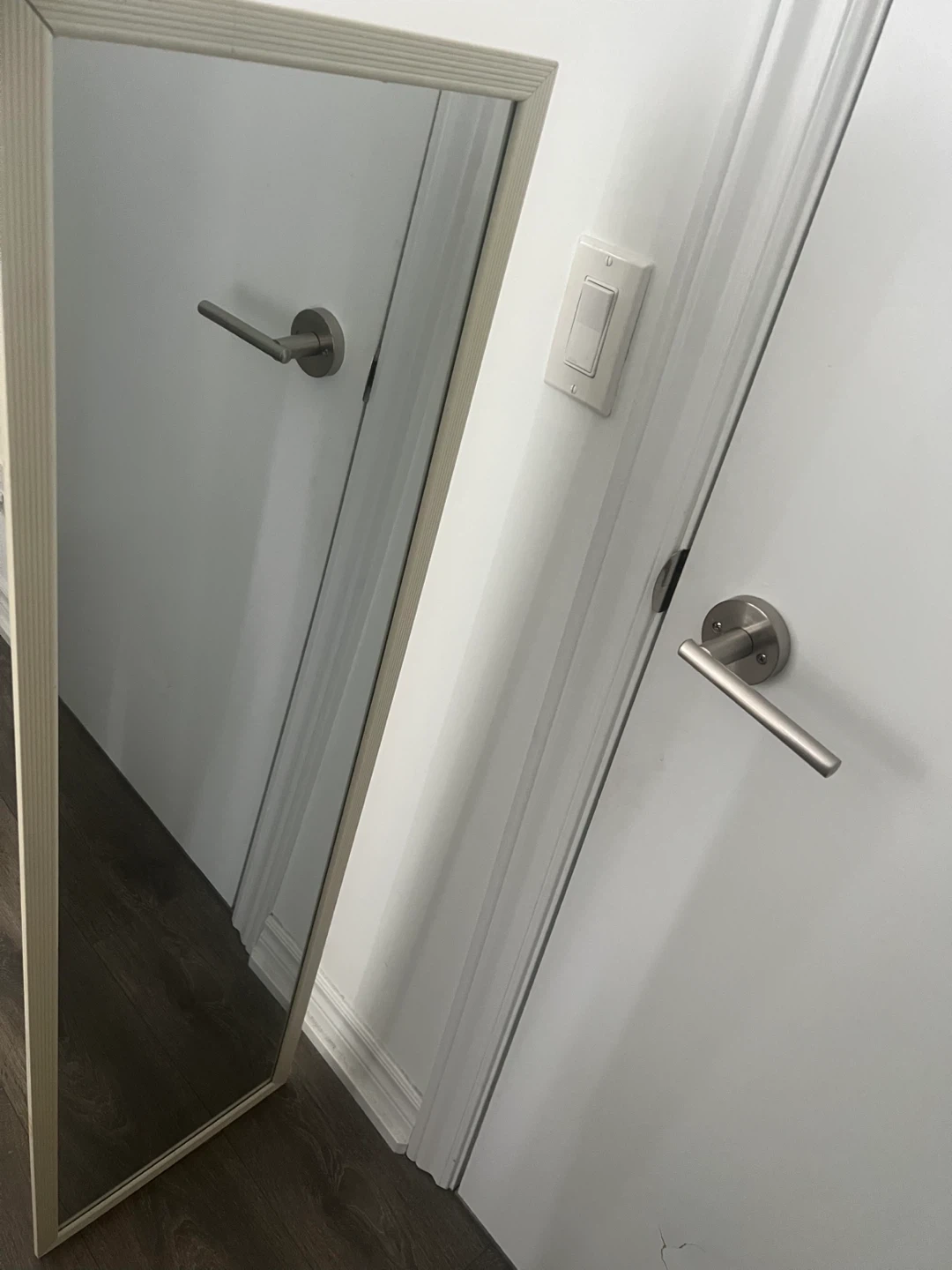 This is a full-length mirror with a light wood frame. It's perfect for checking your outfit before heading out. The mirror is a good size for a bedroom or hallway.