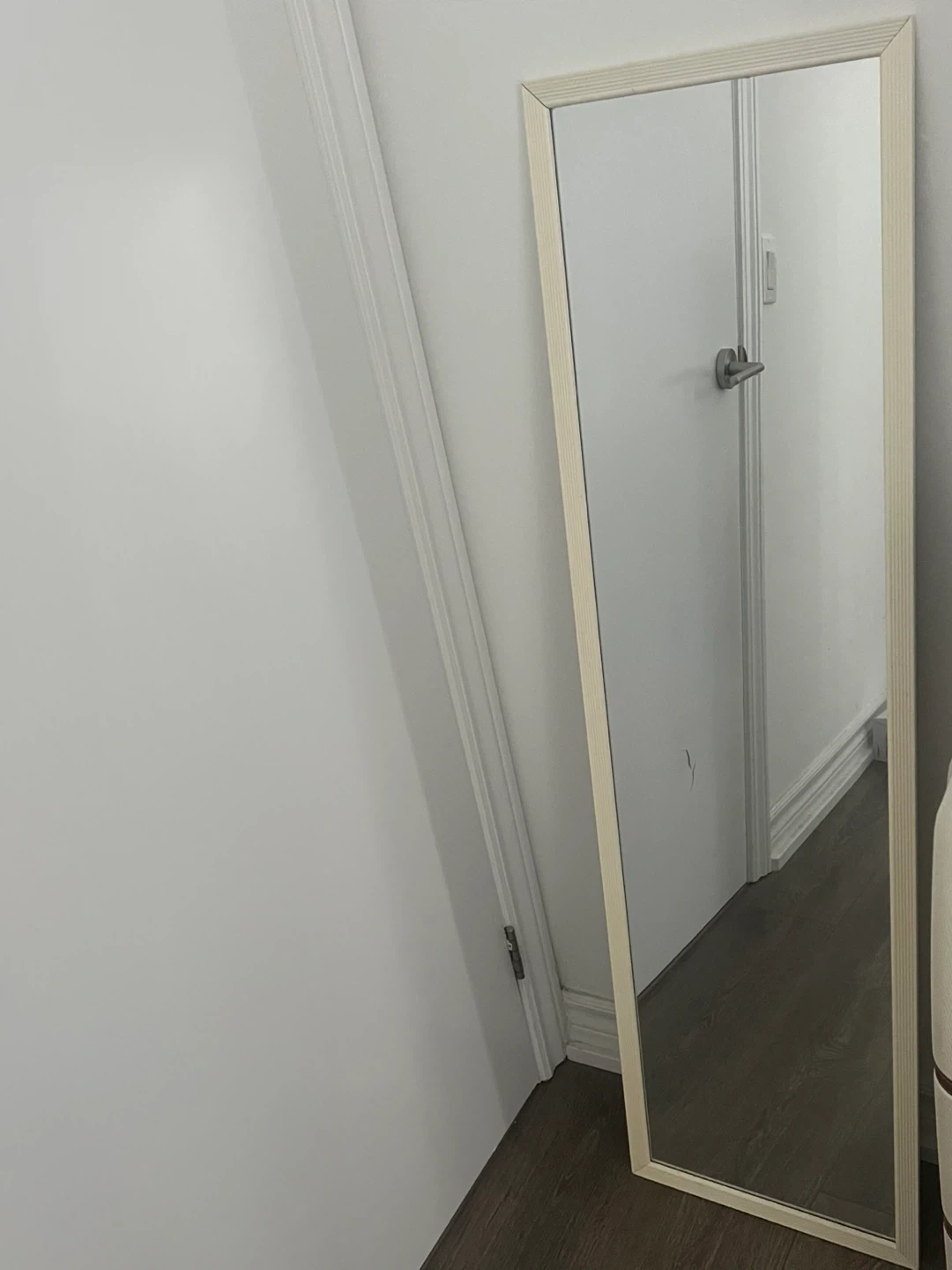 This is a full-length mirror with a light wood frame. It's perfect for checking your outfit before heading out. The mirror is a good size for a bedroom or hallway.