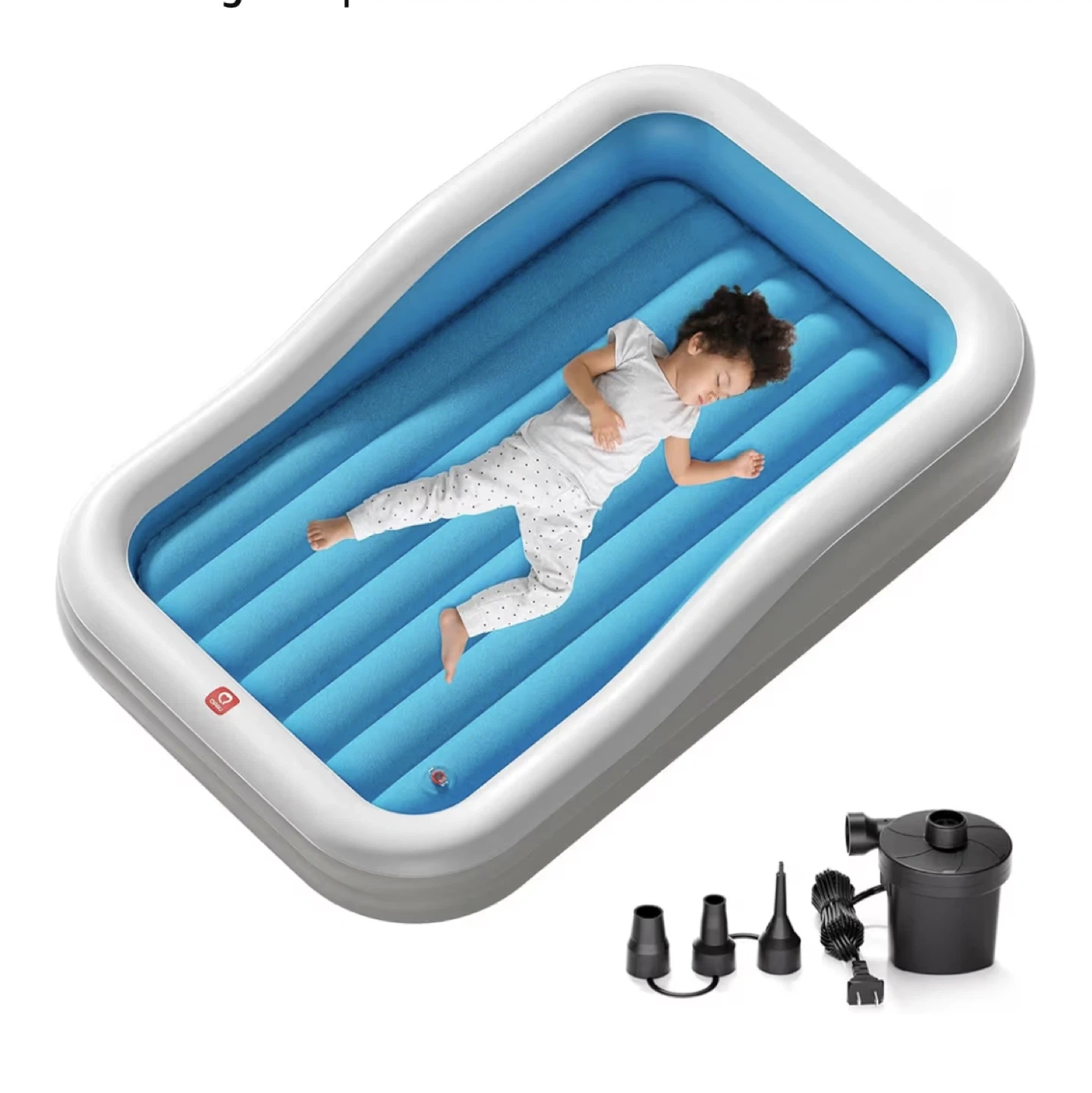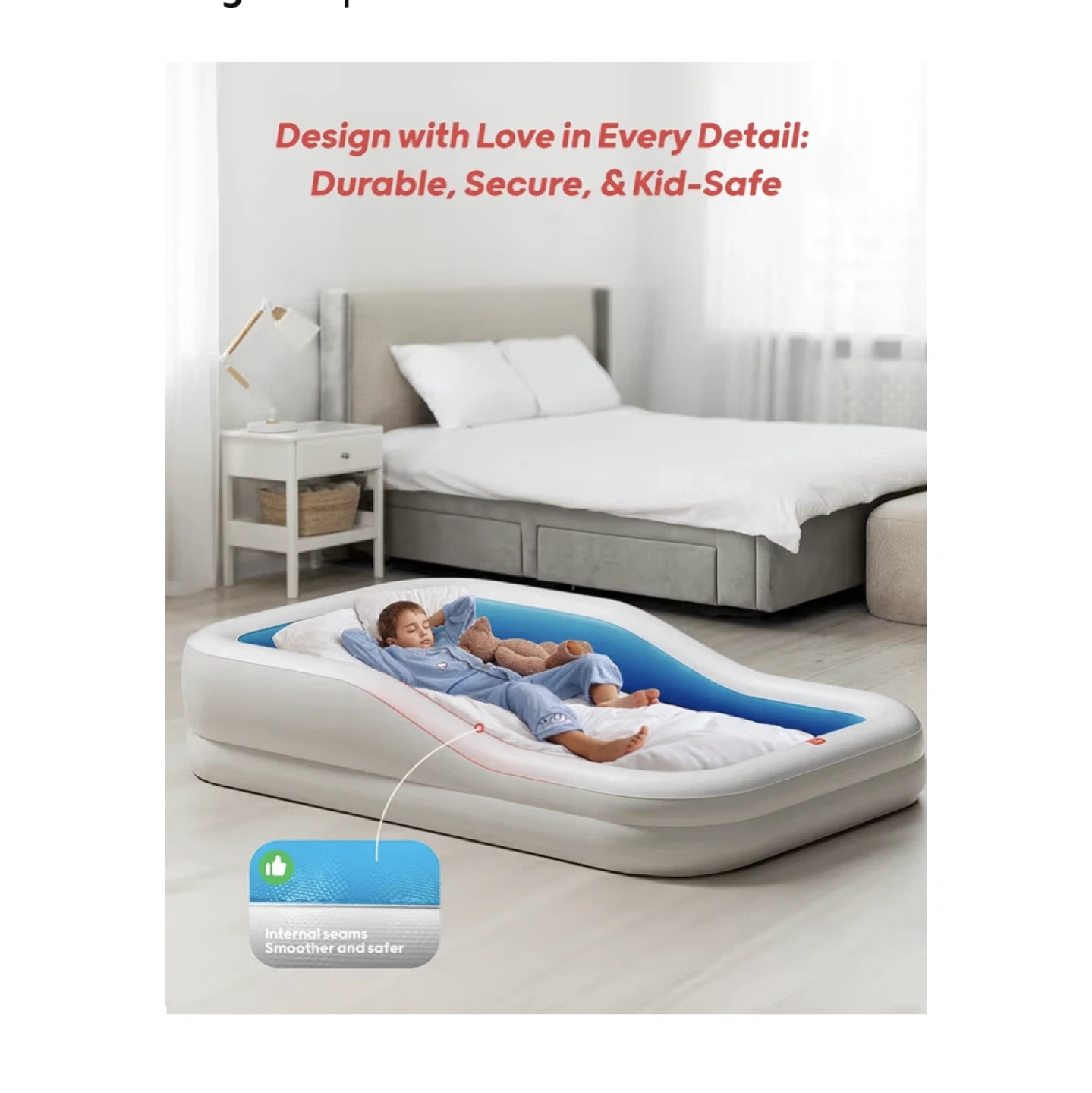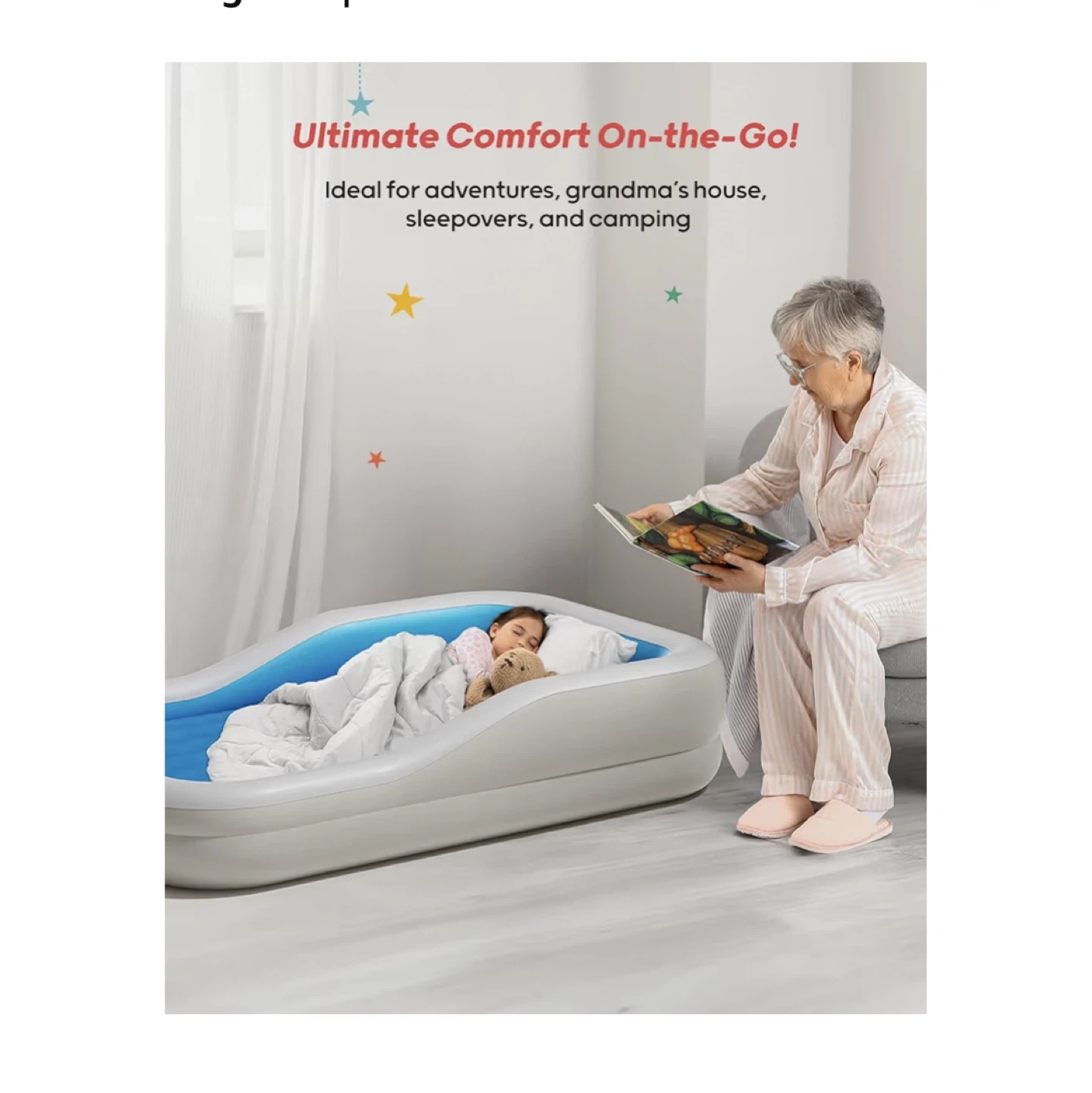 This portable inflatable bed is perfect for toddlers. It's designed for comfort and safety with durable, kid-safe materials. Works with standard crib sheets and blankets.