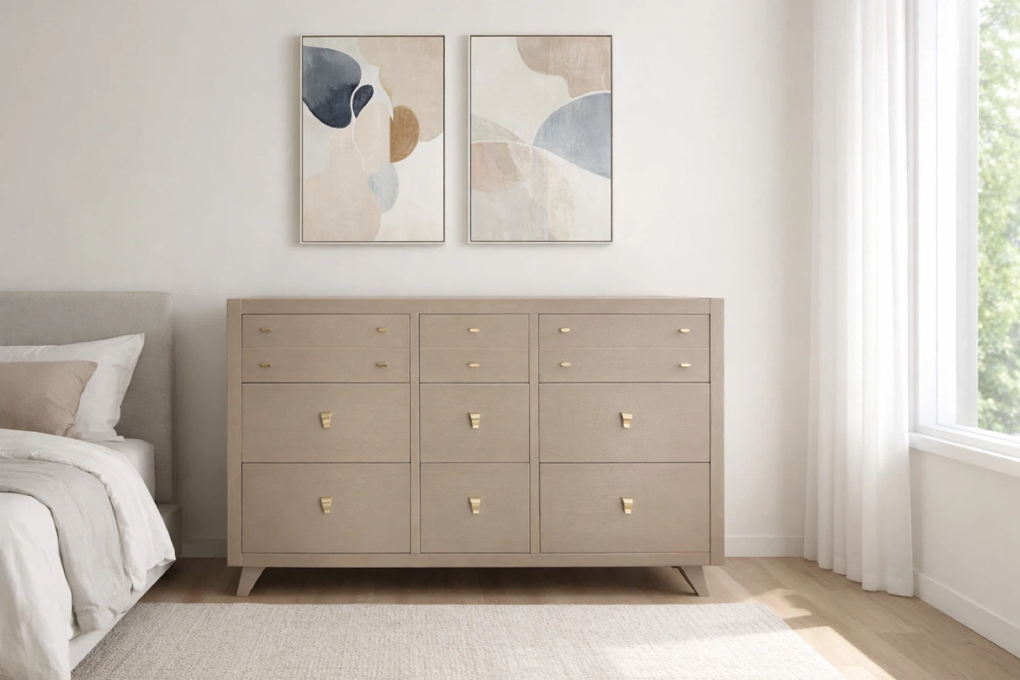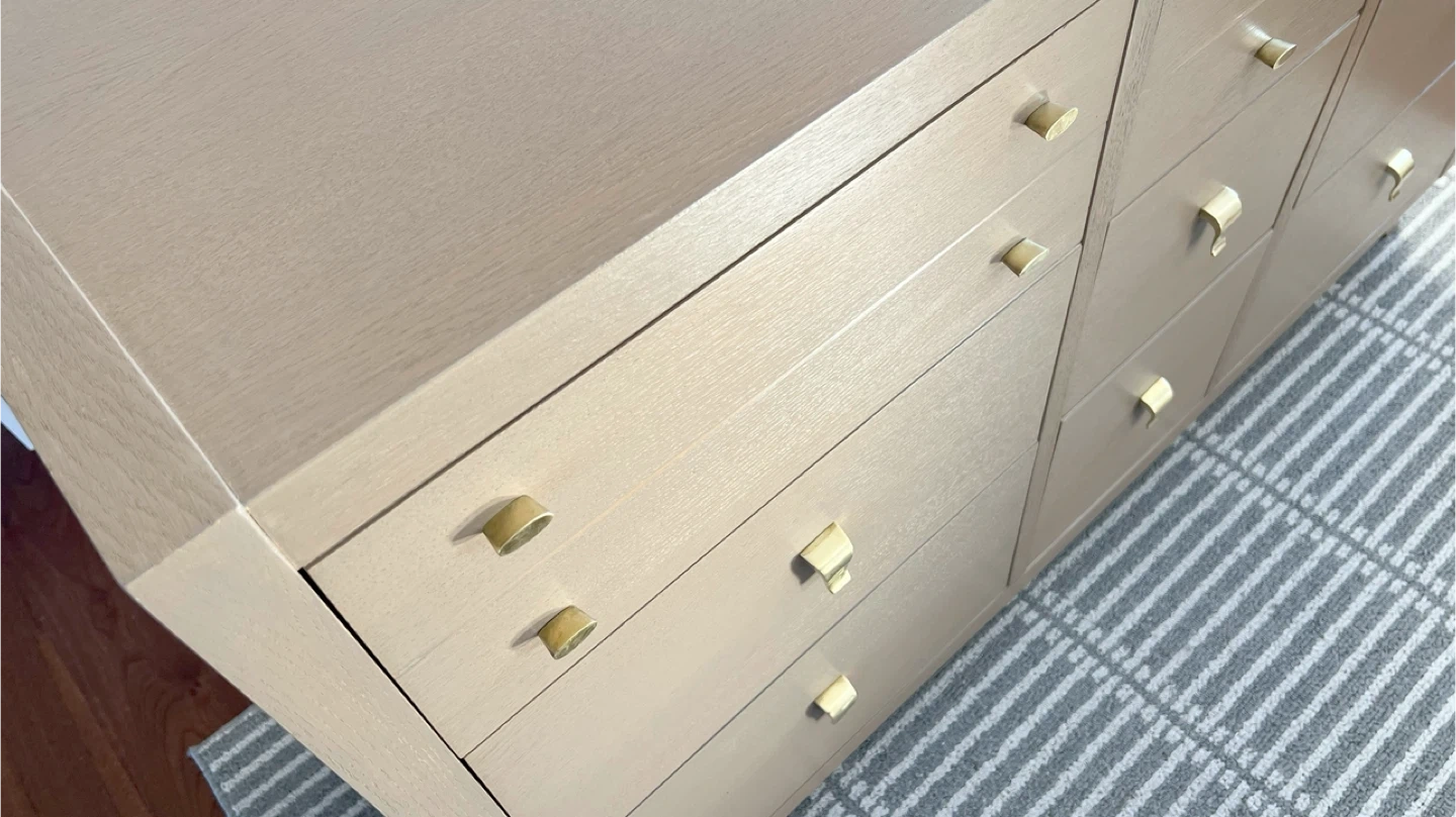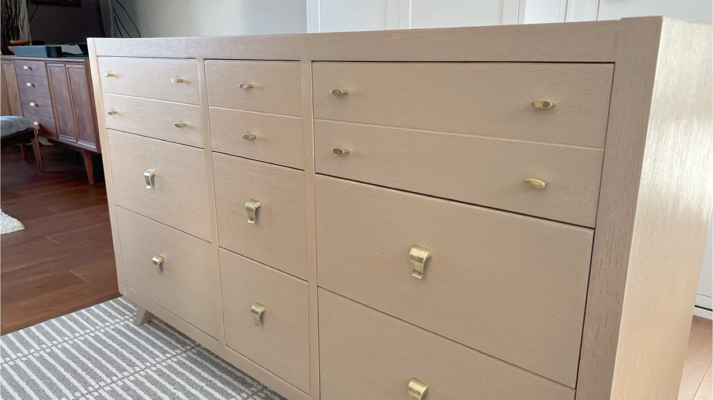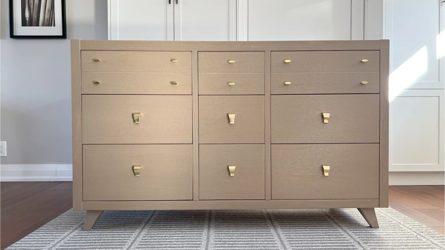 Oak mid-century dresser totally redone inside and out. The finish was stripped and sanded. A neutral paint wash (Algonquin by Fusion Mineral paint) was applied. It was top-coated with General finishes high performance top coat. The hardware is original and solid brass. All drawers slide smoothly.