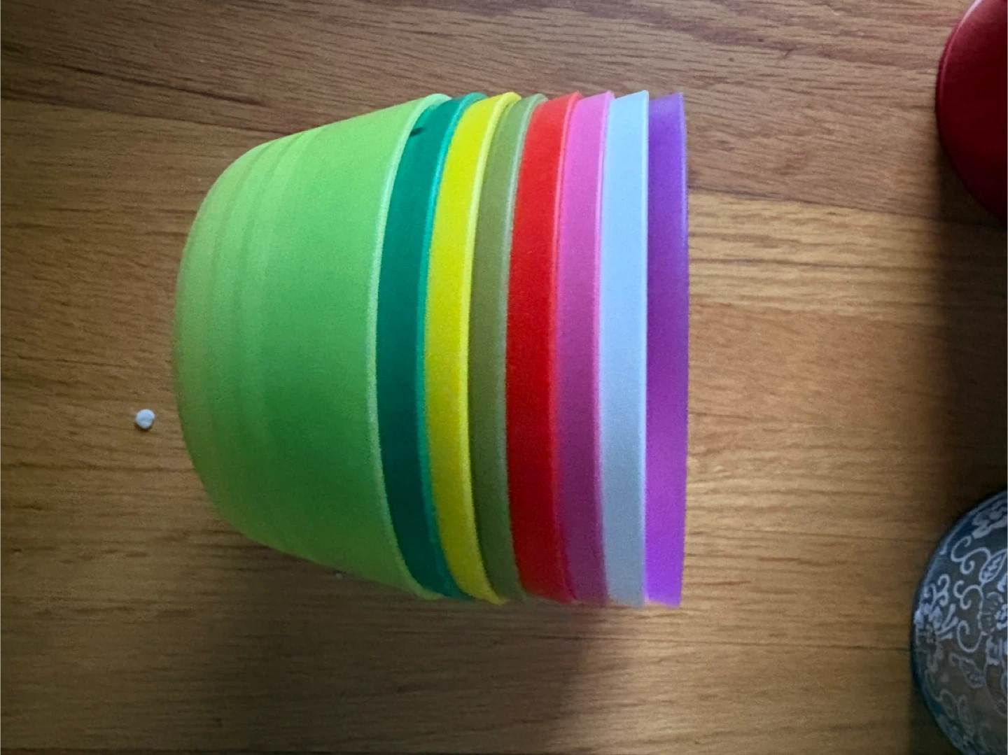 Set of colourful stackable plastic bowls. Includes bowls in green, yellow, red, white, and purple. Perfect for snacks or small servings.pickup at Morley trail NW