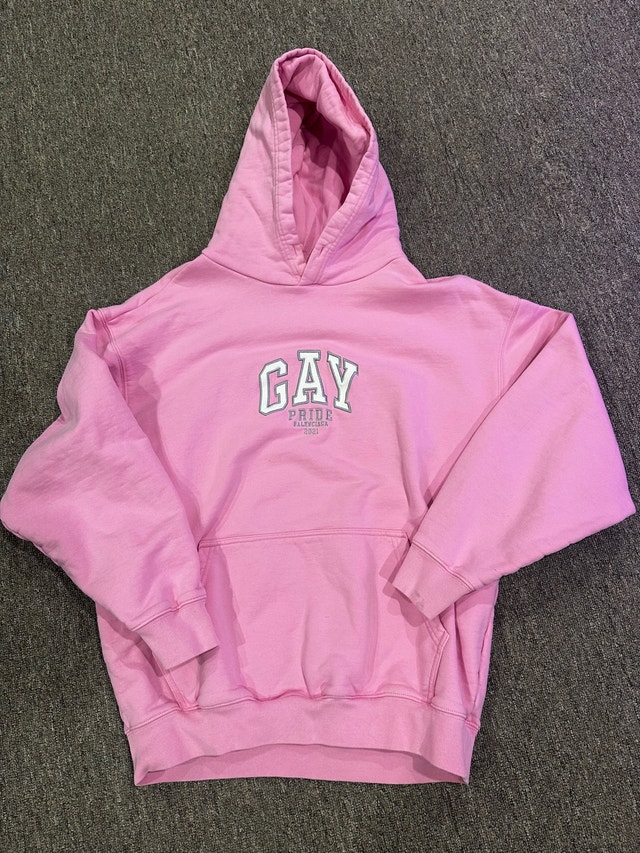 Get ready to turn heads with this eye-catching Balenciaga hoodie in a vibrant pink, size XS! This gently worn hoodie is in good condition, perfect for adding a pop of colour and high-fashion flair to your wardrobe. The stylish "Gay Pride" logo adds a unique touch, making it a standout piece. Here are the details: