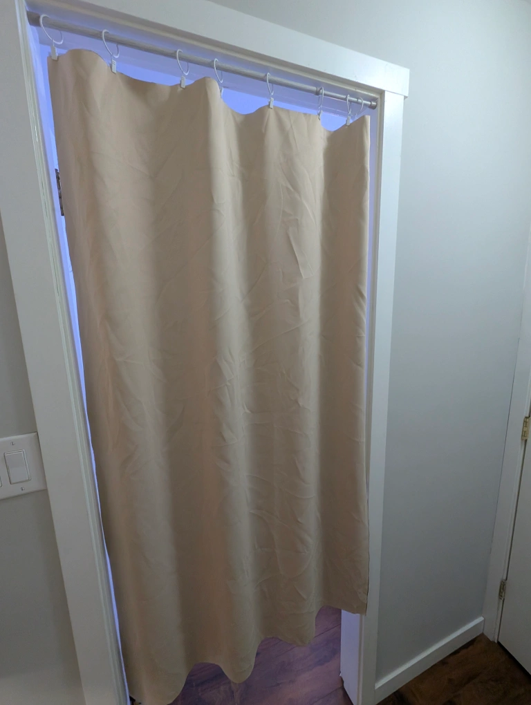 Light beige fabric room divider. Hangs from a simple rod. Good for privacy or dividing space.