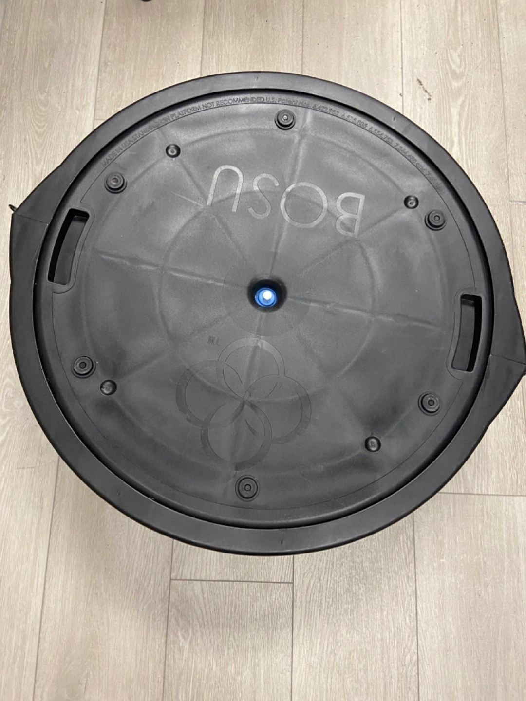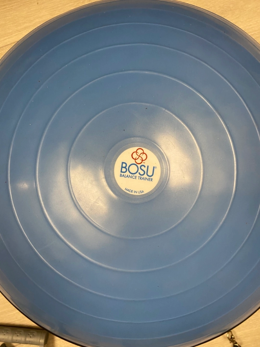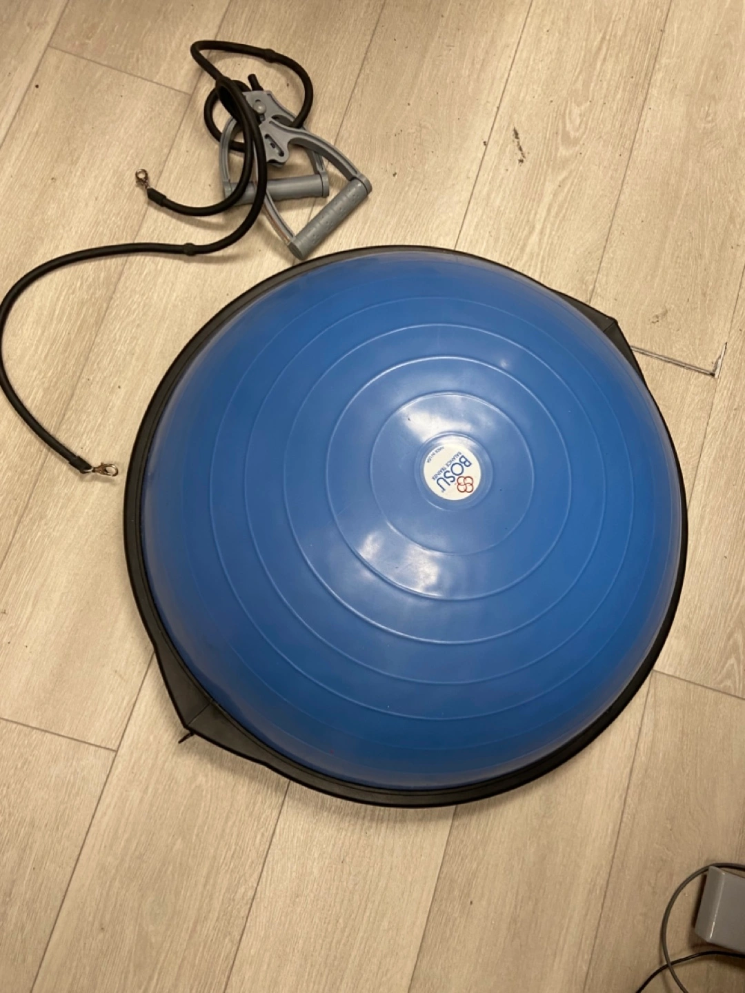 Blue BOSU ball. Includes resistance band. Great for core strengthening and balance exercises. Used but in good condition.