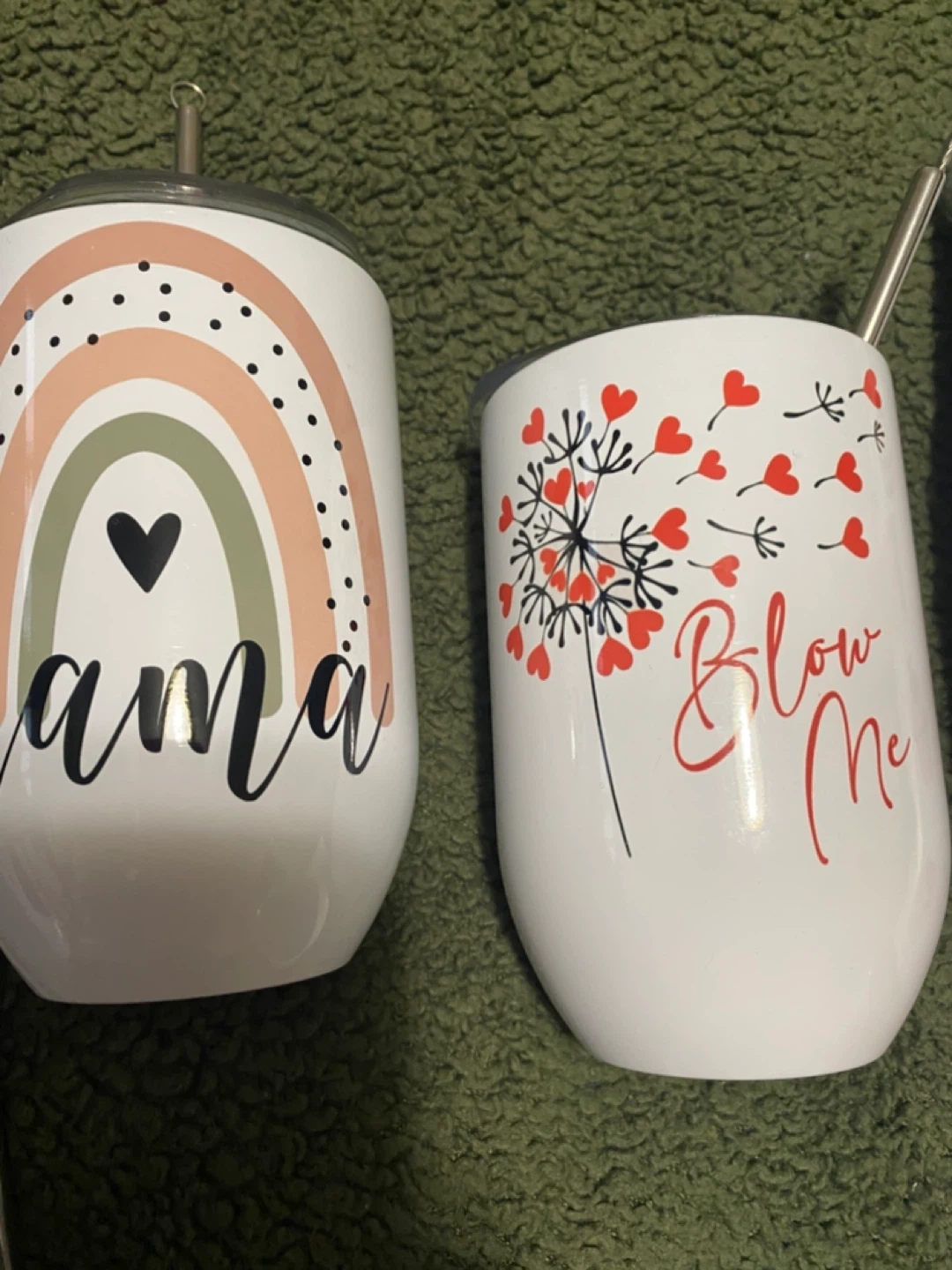 Collection of insulated tumblers and a ceramic mug. Designs include 'mama', 'Blow Me', 'I Just Baked You Some Shut The F*** Up Cupcakes', 'Lake Vibes', 'Because Today Sucked', 'Fun Fact: I Don't Care', 'Classy But A Little Trashy', and 'Proud Member of the Bad Moms Club'. Perfect for hot or cold beverages!