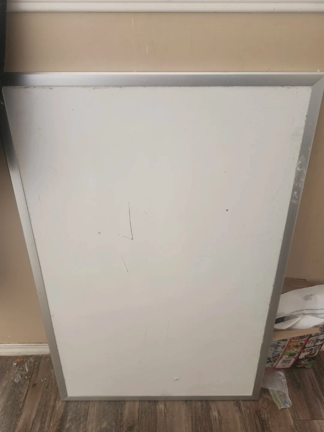 This is a whiteboard with a silver metal frame. It's suitable for notes and brainstorming. The surface has some minor scuffs.