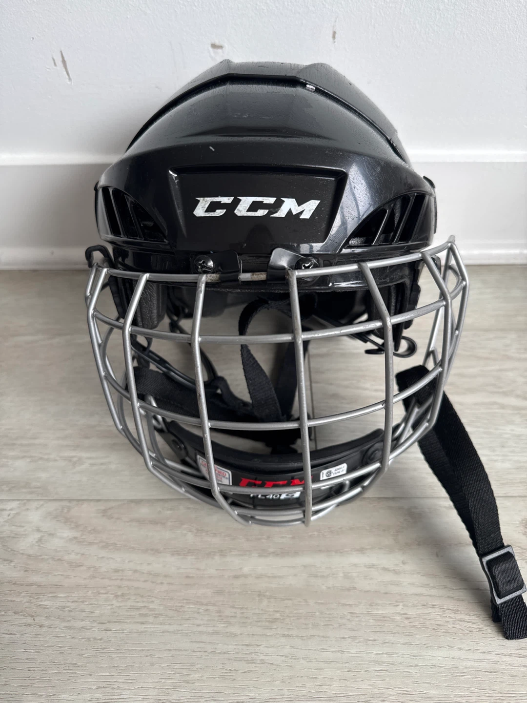 This is a CCM XTS hockey helmet with a cage. It's black and designed for ice hockey. Ice hockey is a collision sport that is dangerous. Severe head, brain or spinal injuries including paralysis can occur. This helmet may not protect you from all injuries. Do not use this helmet if it is cracked, deformed, or has missing parts. Not for use by persons with a history of epilepsy or seizures. Do not use any cleaning agents, decals, paints, or adhesives on this helmet. Carefully read all instructions before wearing.